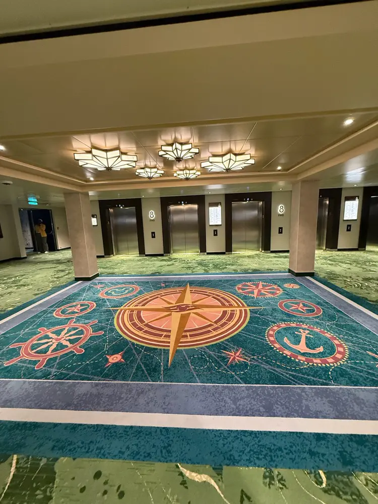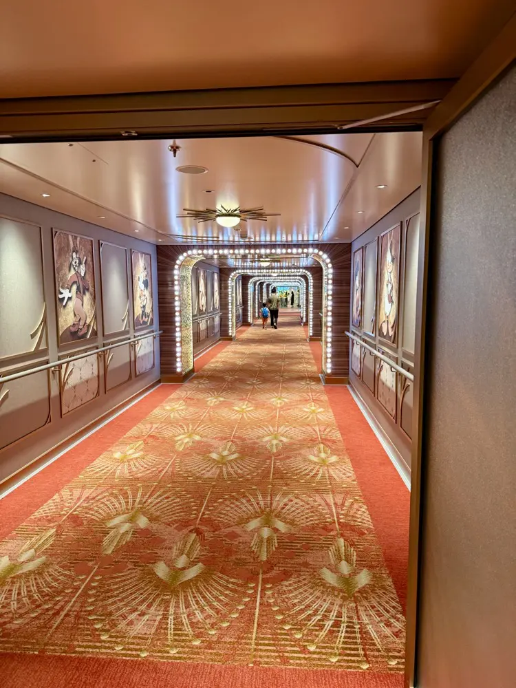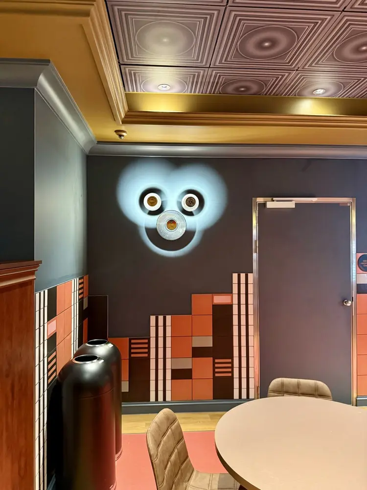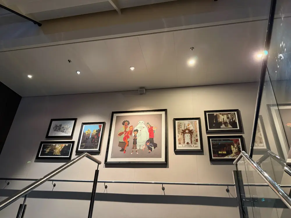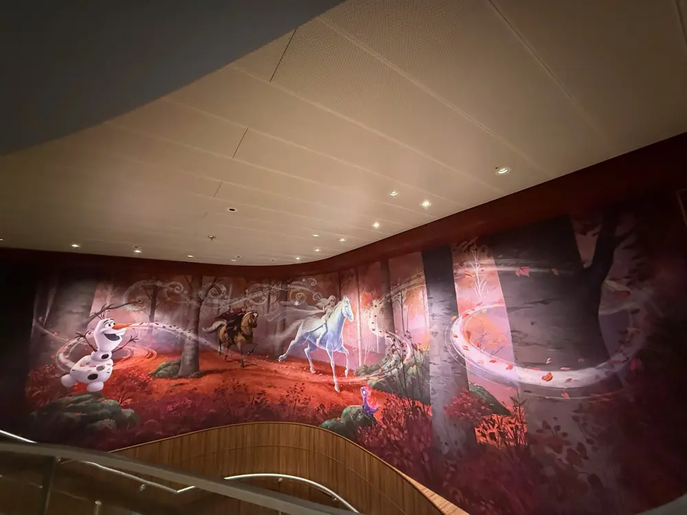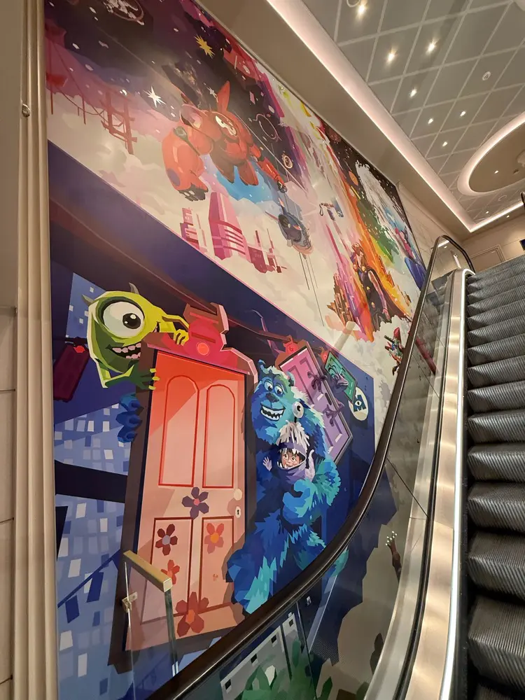 One of the things I want to flag that almost nobody talks about: the corridors and lift areas on this ship are part of the experience. Each deck is themed differently, murals, carpet patterns, artwork, and they connect to the venues on that level. The Monsters Inc. escalator mural above is just one example. It genuinely feels like the theming never stops, even when you’re just walking back to your room.