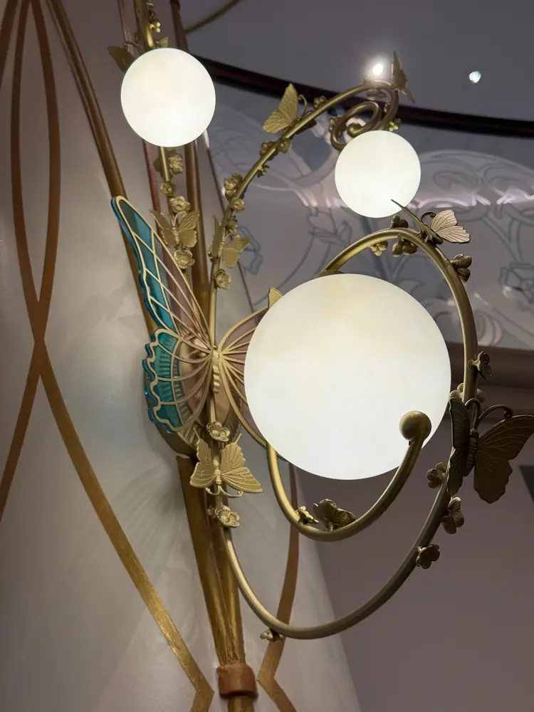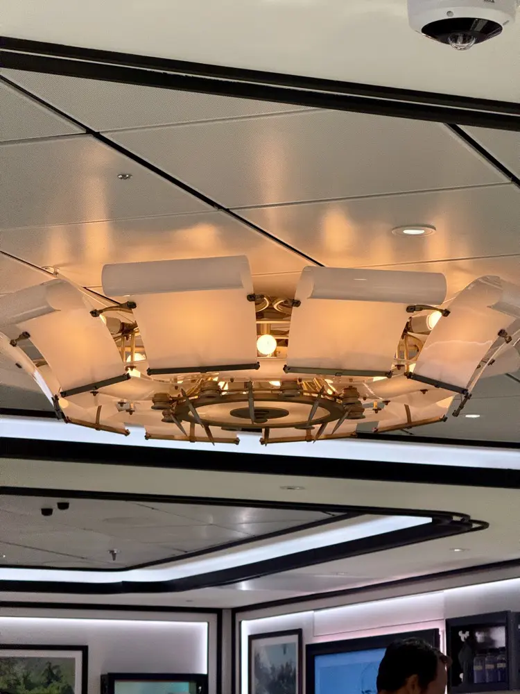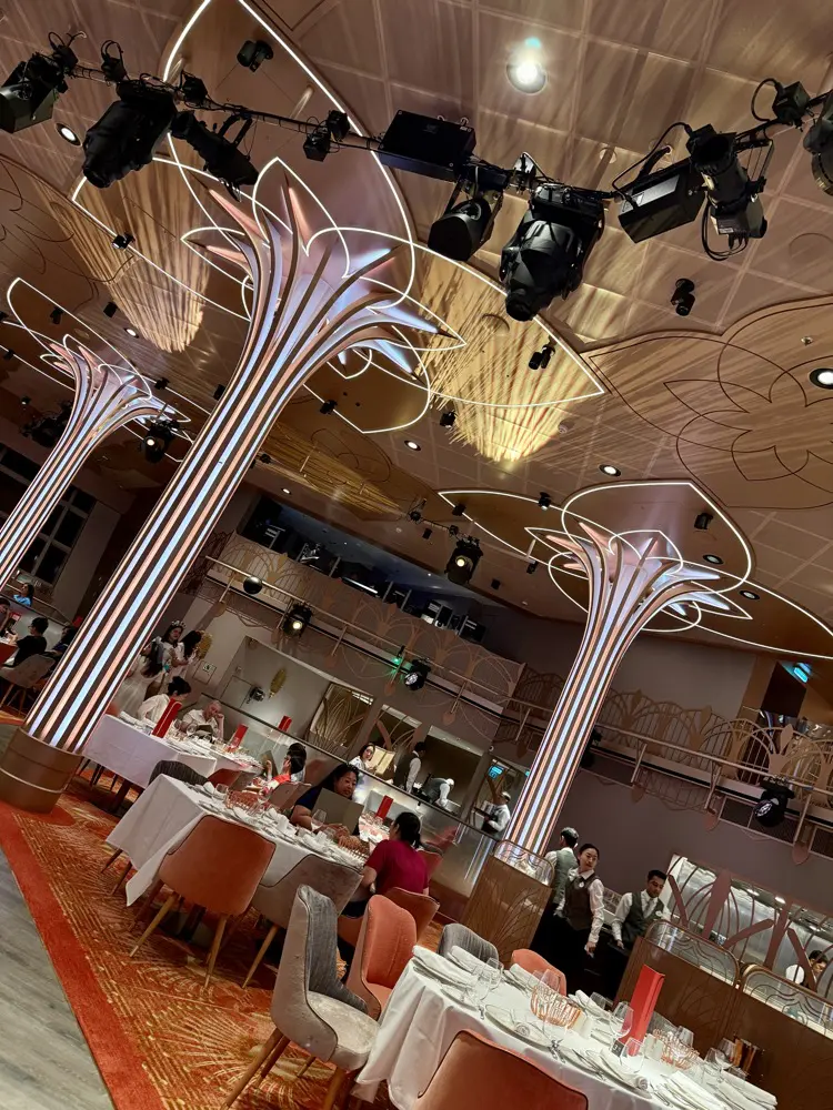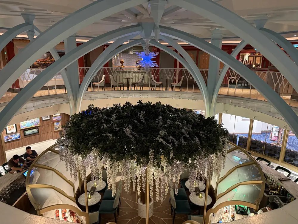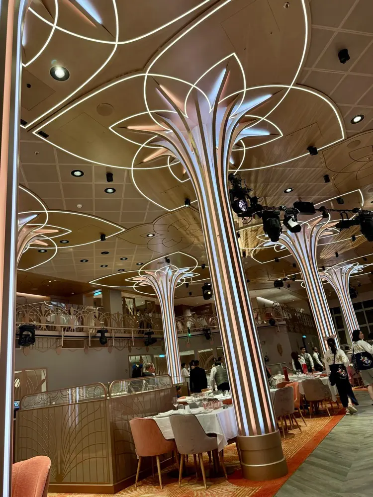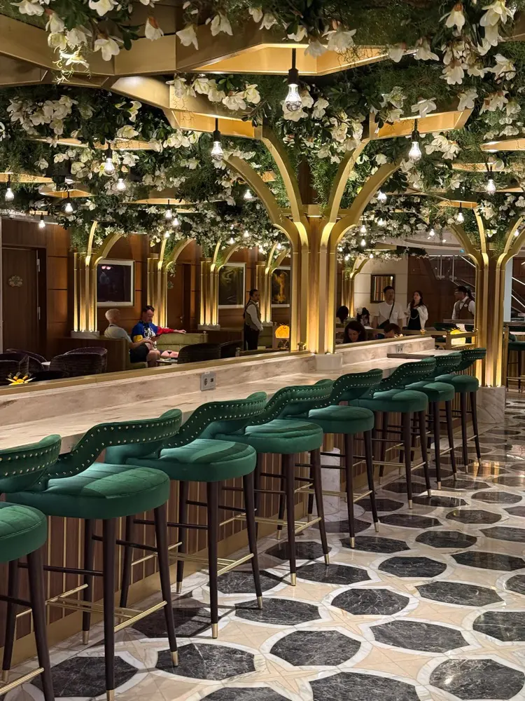 The detail in this space is extraordinary. The light fittings alone are works of art, intricate gold butterfly sculptures that belong in a gallery, not on a cruise ship.