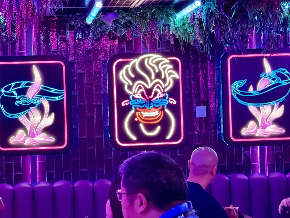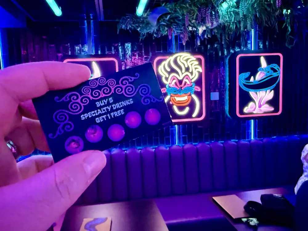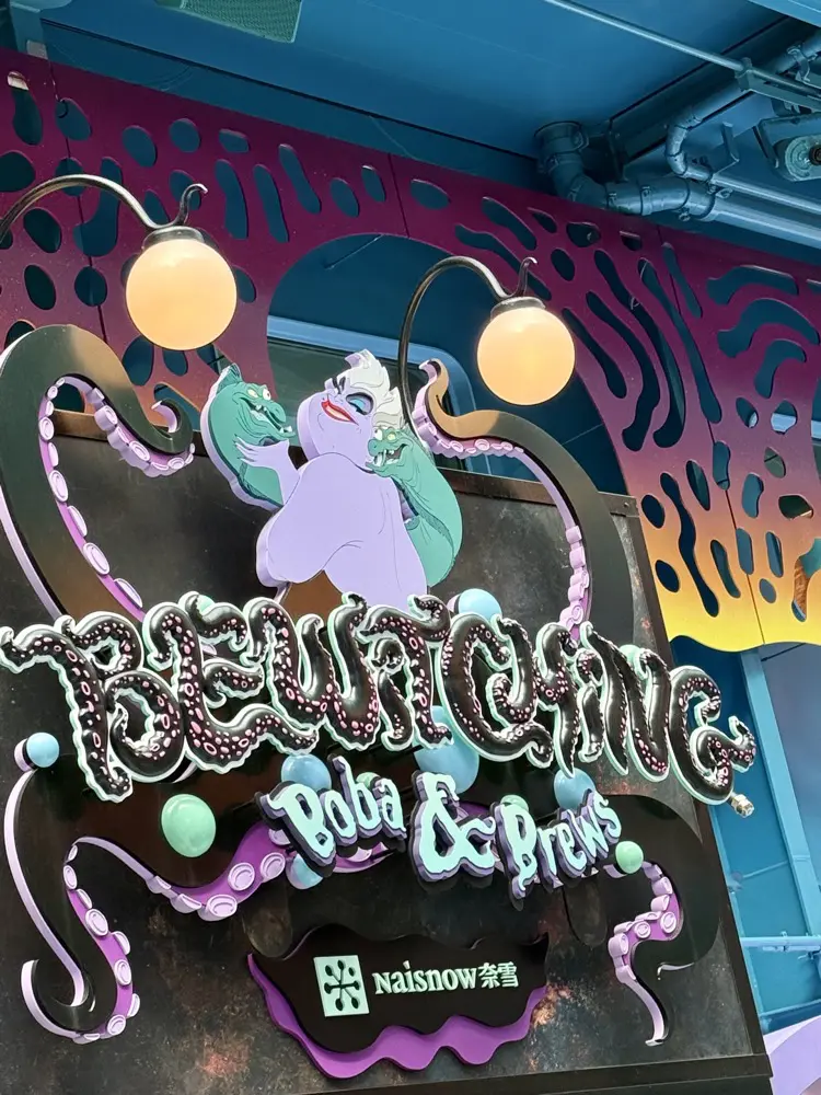 Bewitching Boba and Brews is Ursula-themed, brilliantly designed, and absolutely non-negotiable if you’ve never had proper bubble tea. The sign alone, with Ursula herself, flanked by Flotsam and Jetsam is worth a photo before you’ve even ordered. I had matcha with brown sugar boba every single day, and I am not apologising for that either. There’s a loyalty card. Five boba teas earn you a free one. Yes, we filled it.