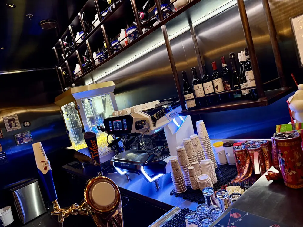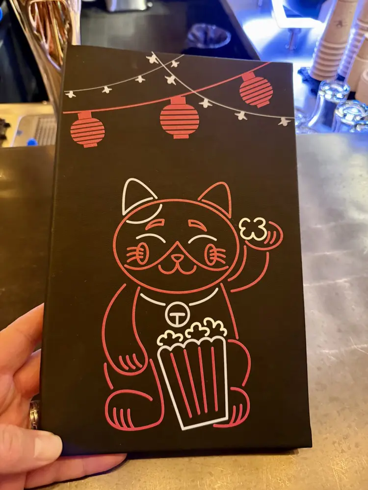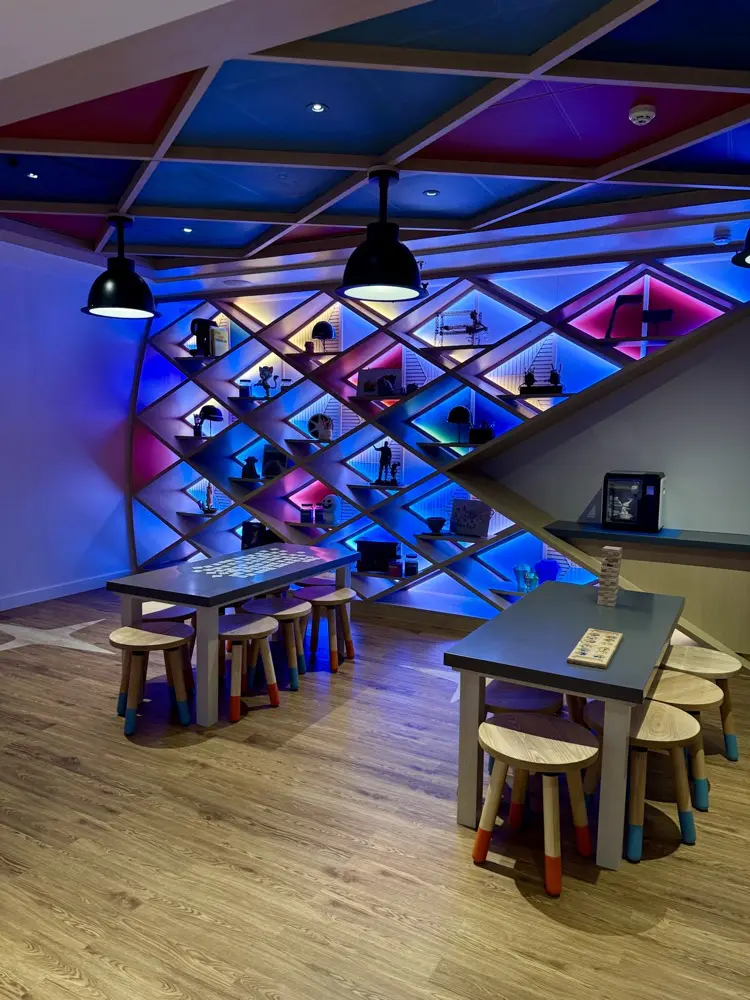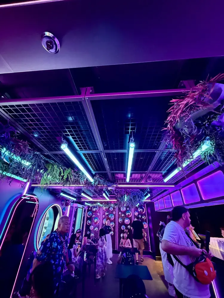 The district has its own neighbourhood bar, the Alley Cat Café, with a neon lucky cat (Maneki-neko) sign that is one of my favourite pieces of theming on the whole ship. Inside, it’s moody and atmospheric: dark wood, Edison-bulb strings, Tiger beer on tap, a proper espresso machine. It’s a great space to grab a drink or a snack as the kids enjoy the nearby arcade games, each themed to Big Hero 6.