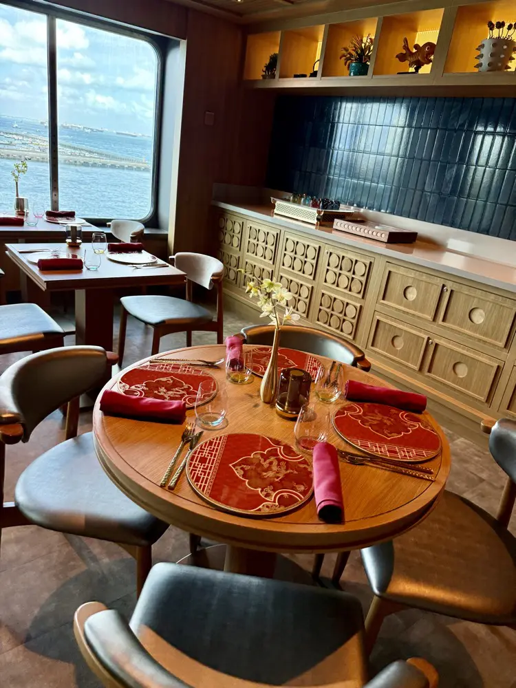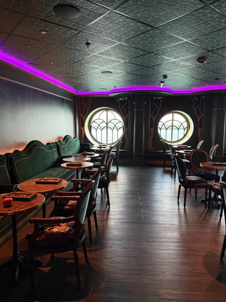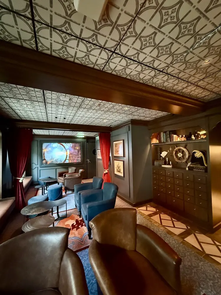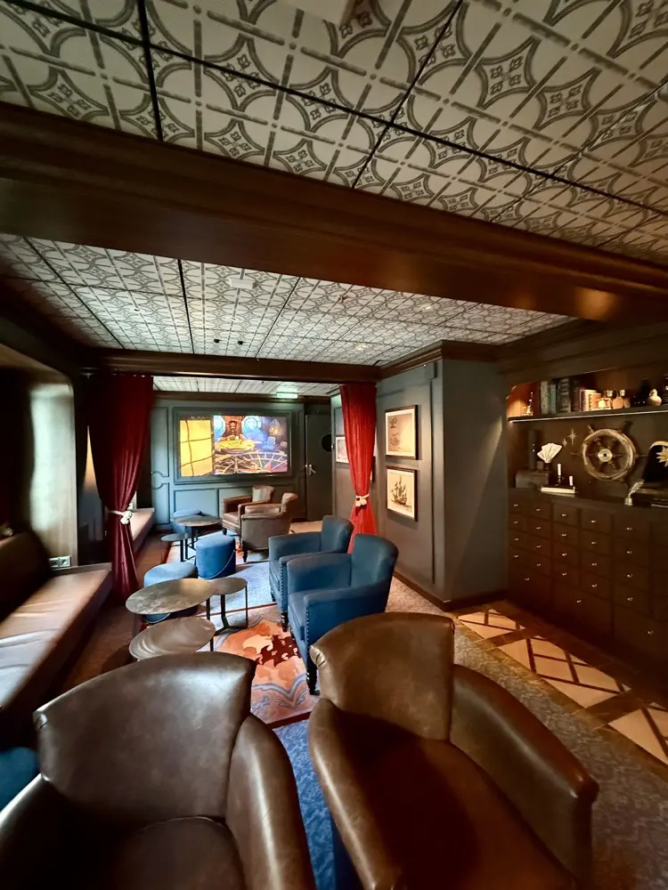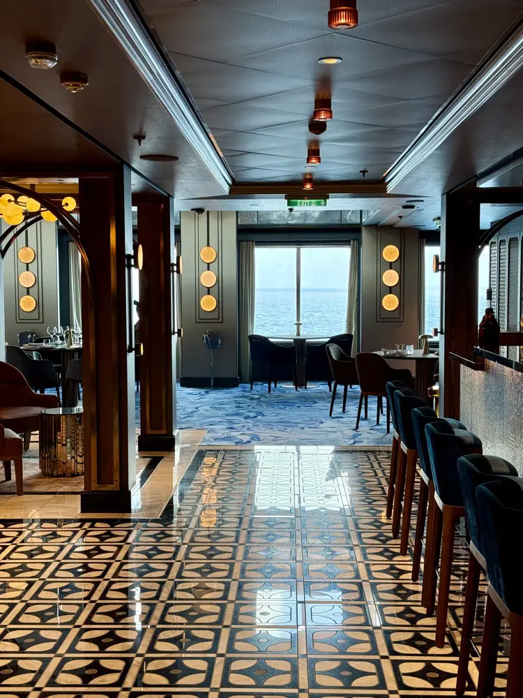 Navigators Club is its nautical sibling — rich red chairs, warm amber lighting, the atmosphere of a captain’s private dining room. Similarly theatrical in its own way, and gorgeous.