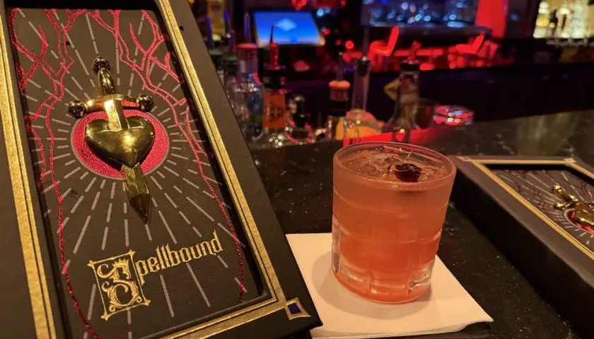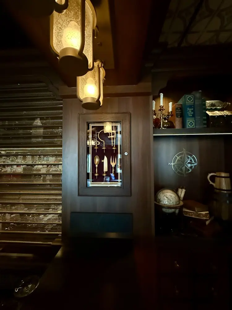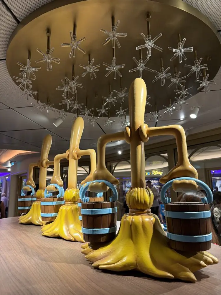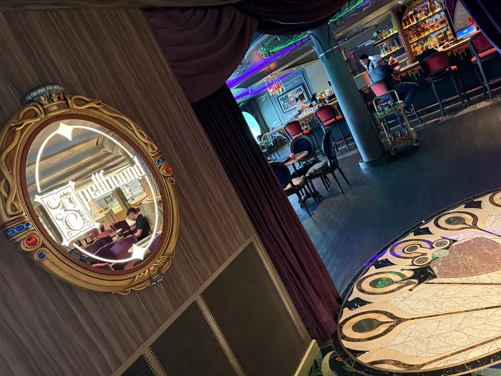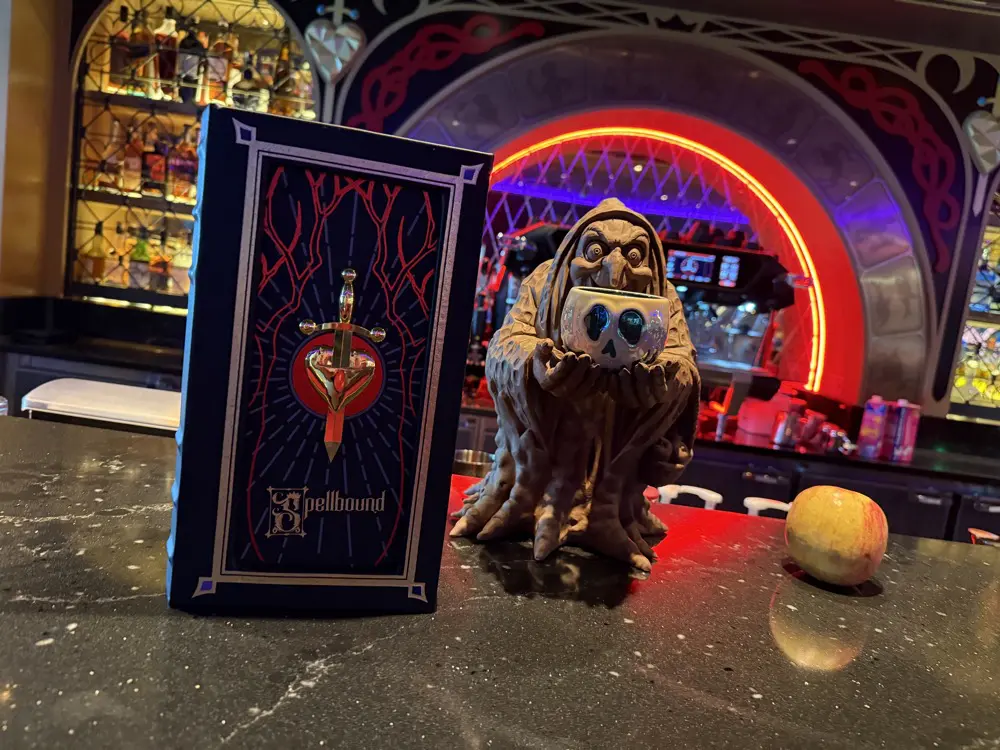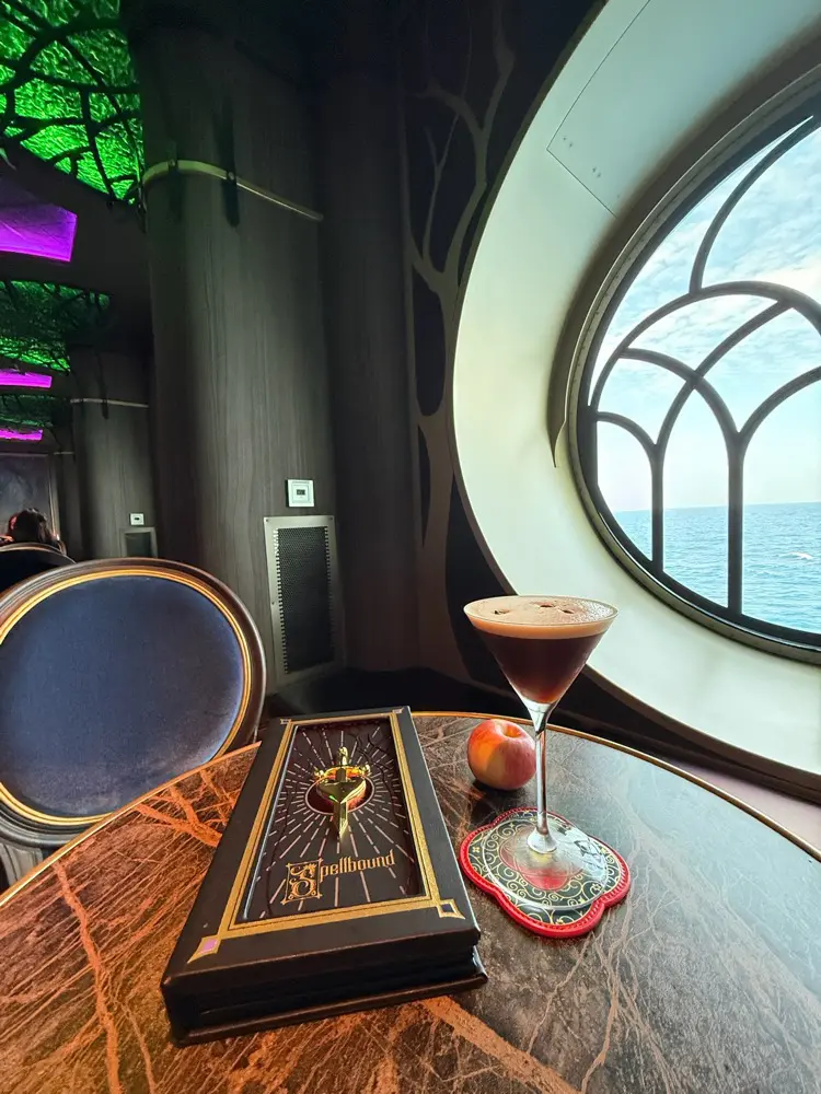 Next door to the wishing well is Spellbound, themed after the Evil Queen from Snow White, and it is the bar on this ship. Dark jewel tones, dramatic draping, a stunning jewel-encrusted mirror at the entrance, and a cocktail menu built around the Evil Queen’s world, including, yes, a poison apple cocktail that’s every bit as good as it sounds, with an optional Tiki-style cup of the Evil Queen, which is available to purchase. We kept finding ourselves back here at the end of the day for one last concoction before bed. Not sorry about that at all.