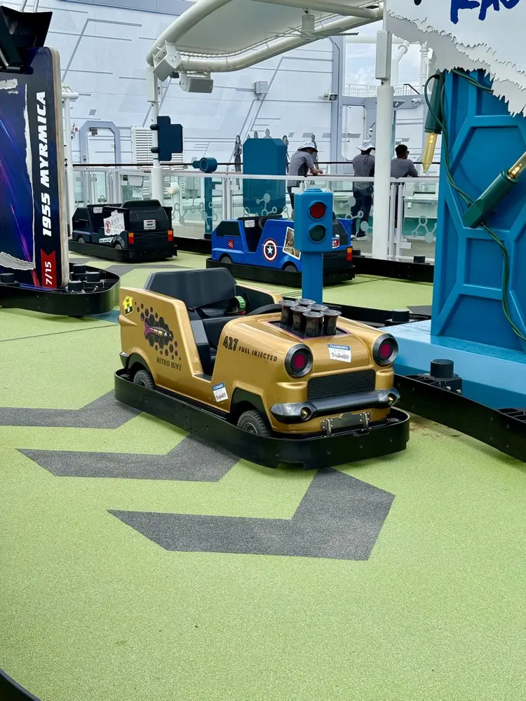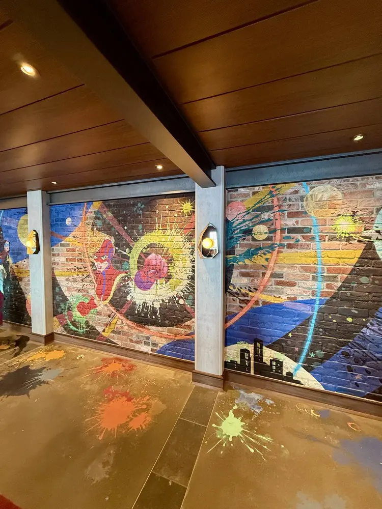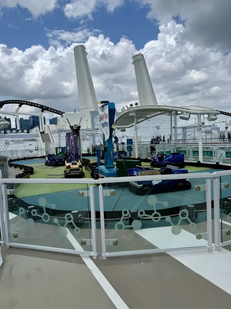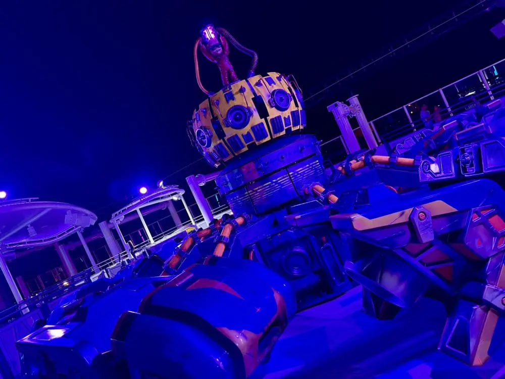 Marvel Landing sits just aft of Toy Story Place and is one of the most impressive outdoor spaces on the ship. From above, the Iron Cycle roller coaster track wraps dramatically around the entire upper deck. When it’s running, it will be unlike anything else at sea. At our time of sailing. it was still working through its final operational testing, but it looks incredible.