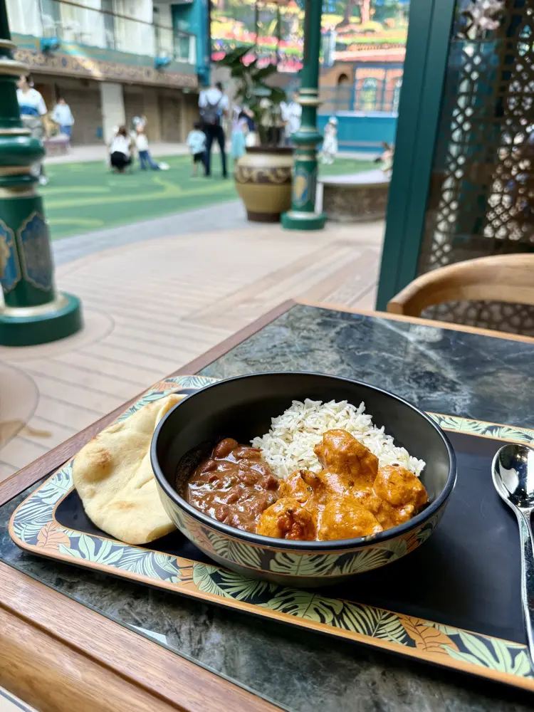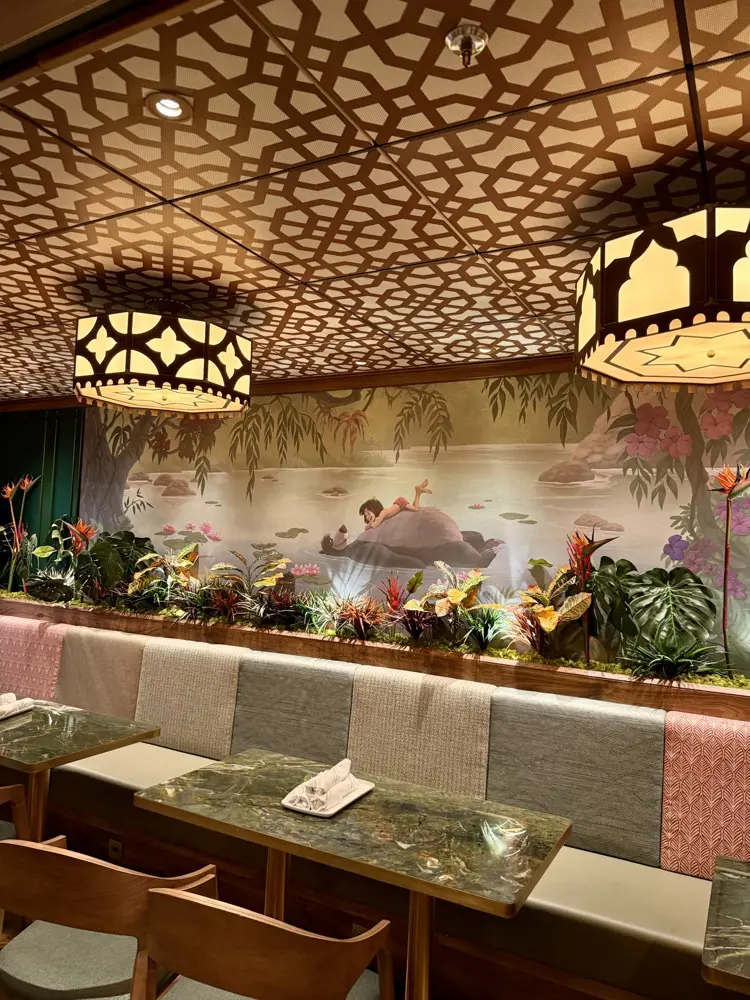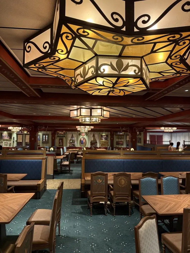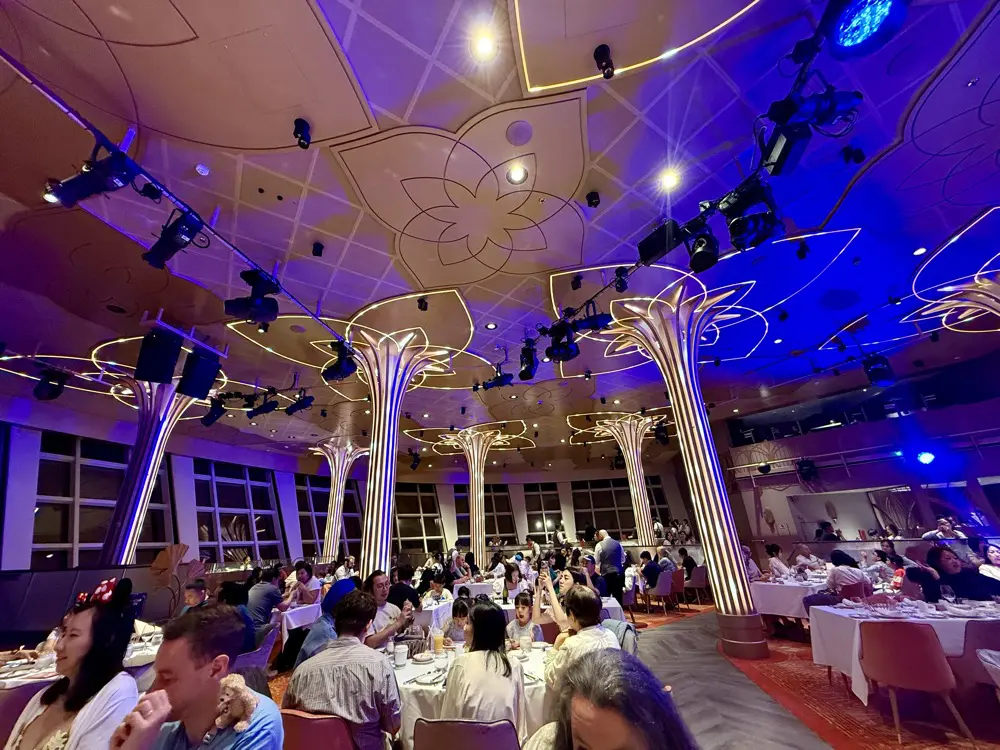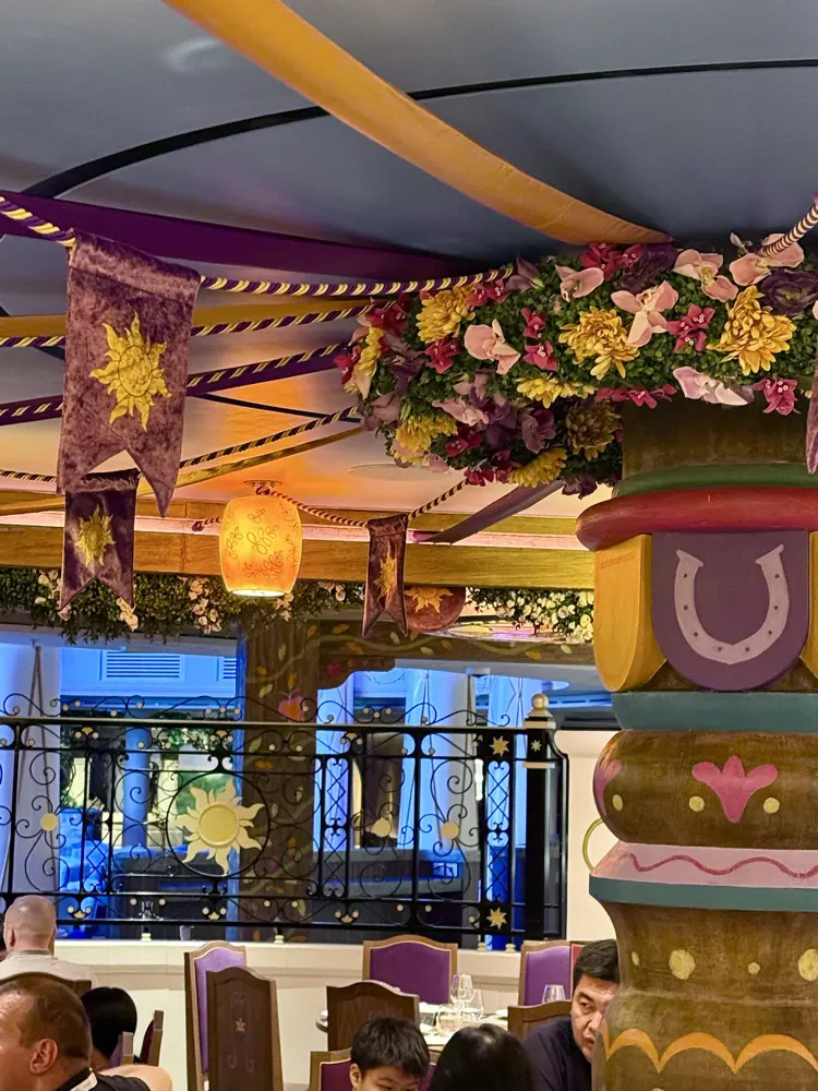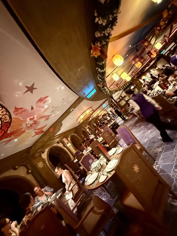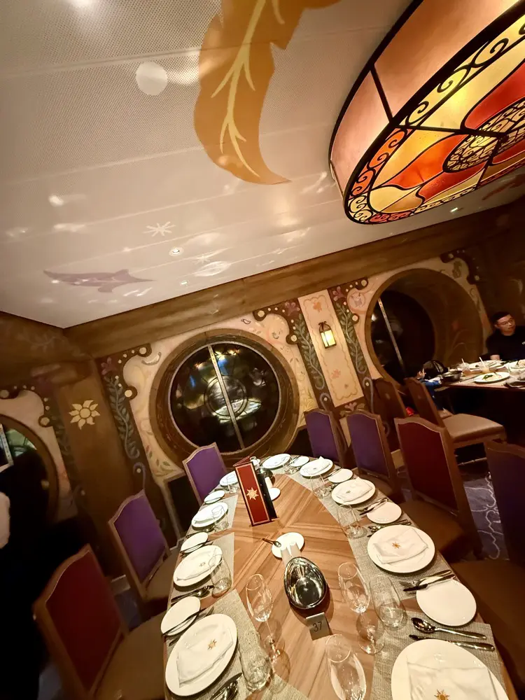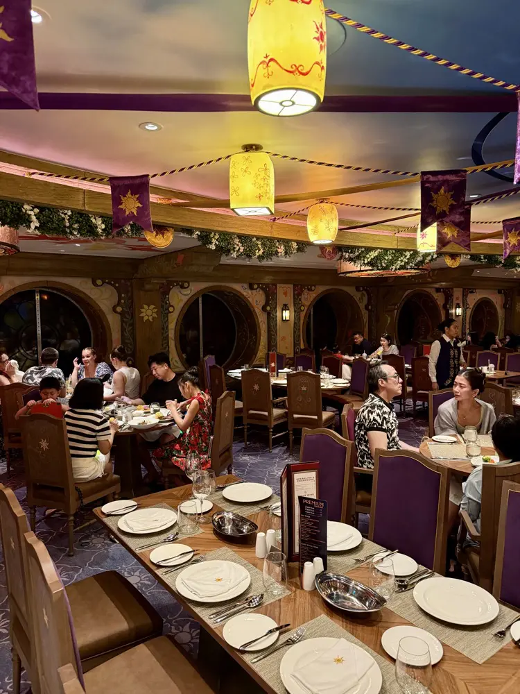 Two halves of the same restaurant, themed after Tangled (Maximus) and Frozen (Olaf). The warm amber lantern lighting in Maximus is gorgeous, and the garden-to-fork menu is genuinely one of the more interesting options in the rotation. Worth noting: during the day, Enchanted Summer operates as a buffet lunch venue — the same space, completely transformed.