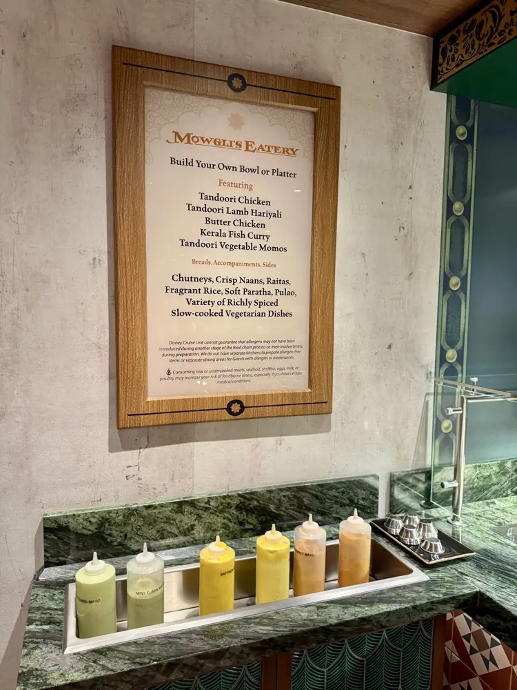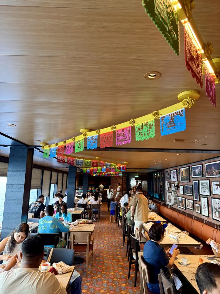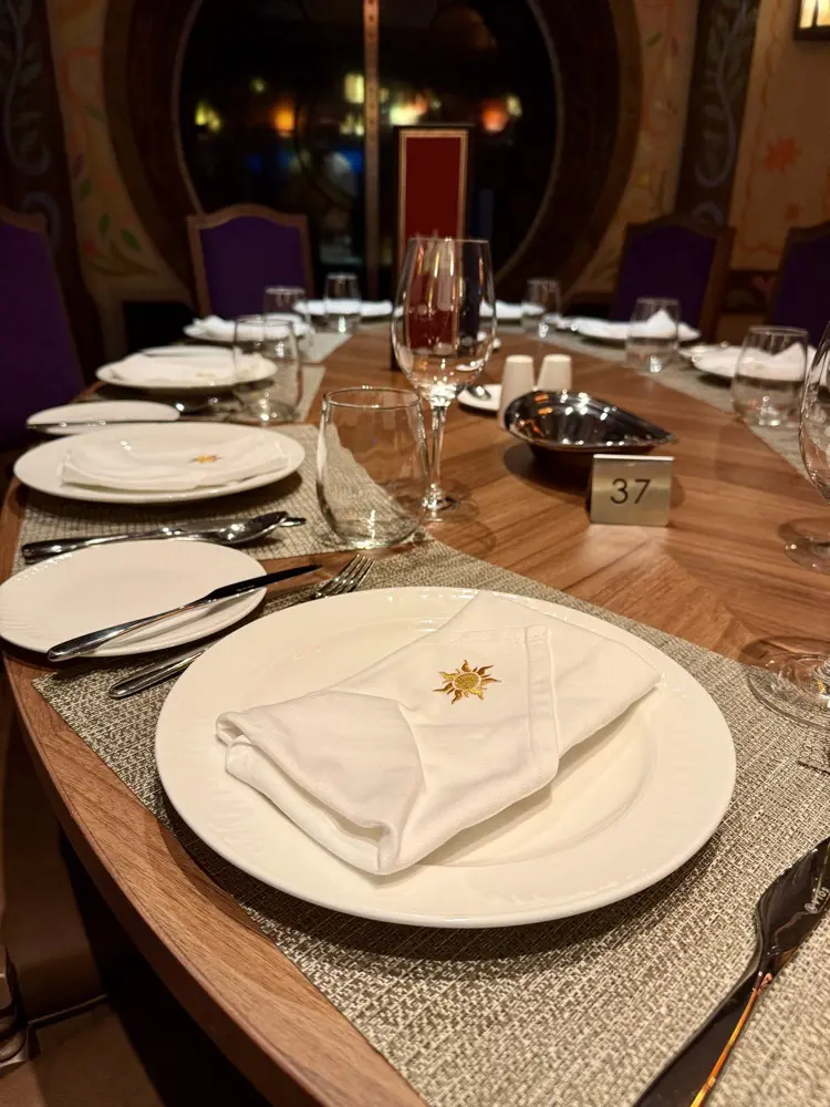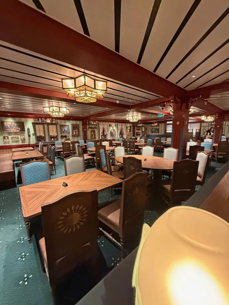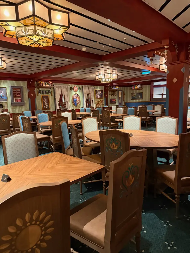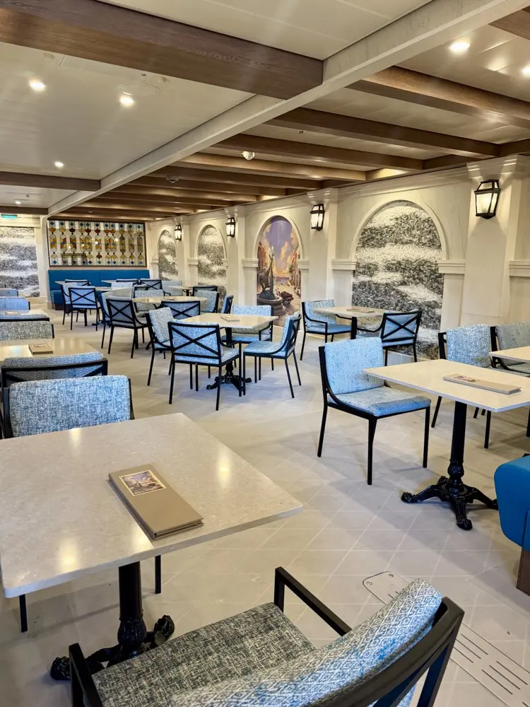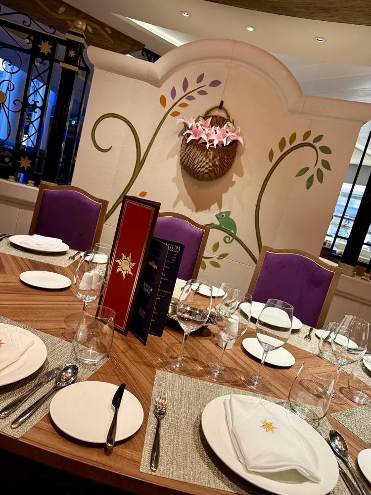 One of the most unique aspects of the Disney Adventure versus any other ship in the fleet: she has six rotational restaurants, but on a 3 or 4-night sailing, you’ll dine in three. They’re arranged in pairs with matching concepts but different theming, and your rotation is assigned at booking.