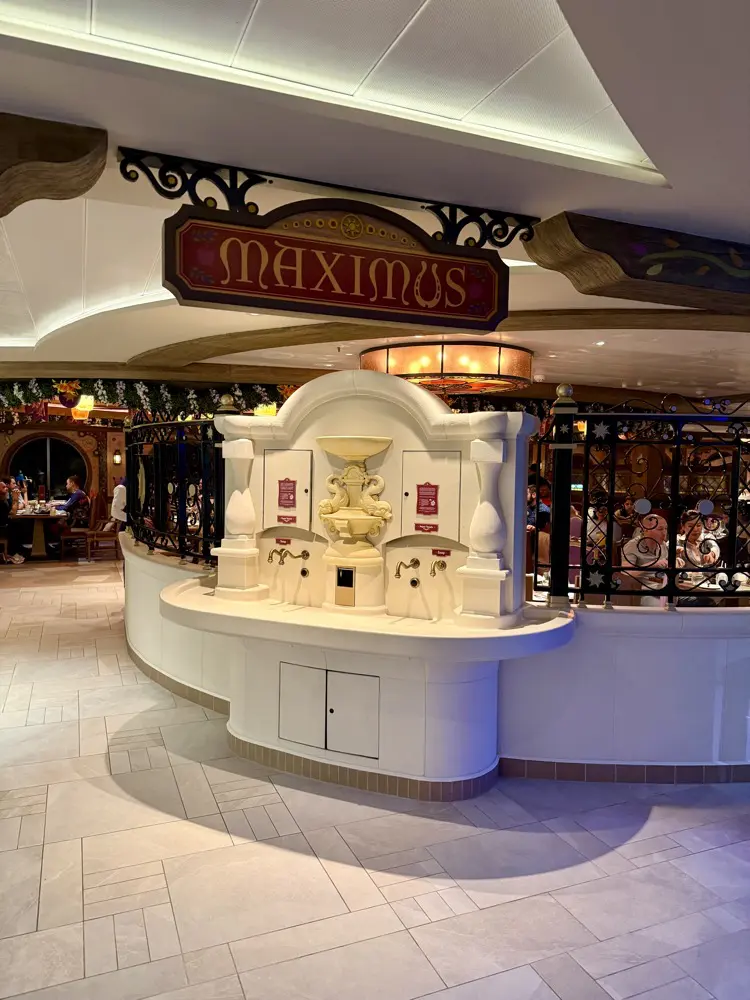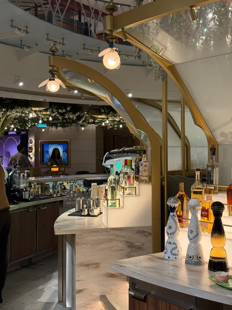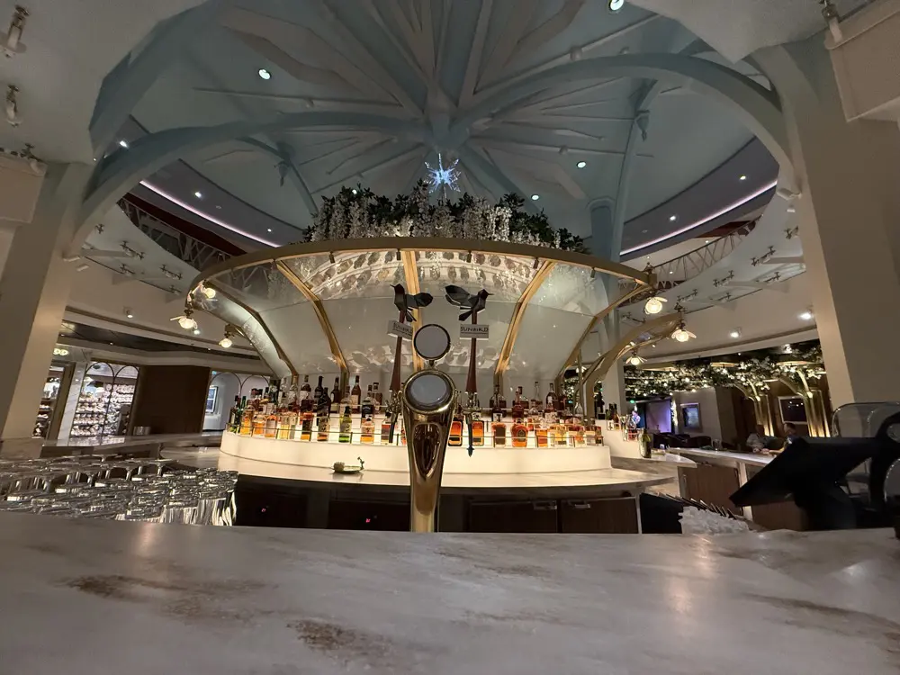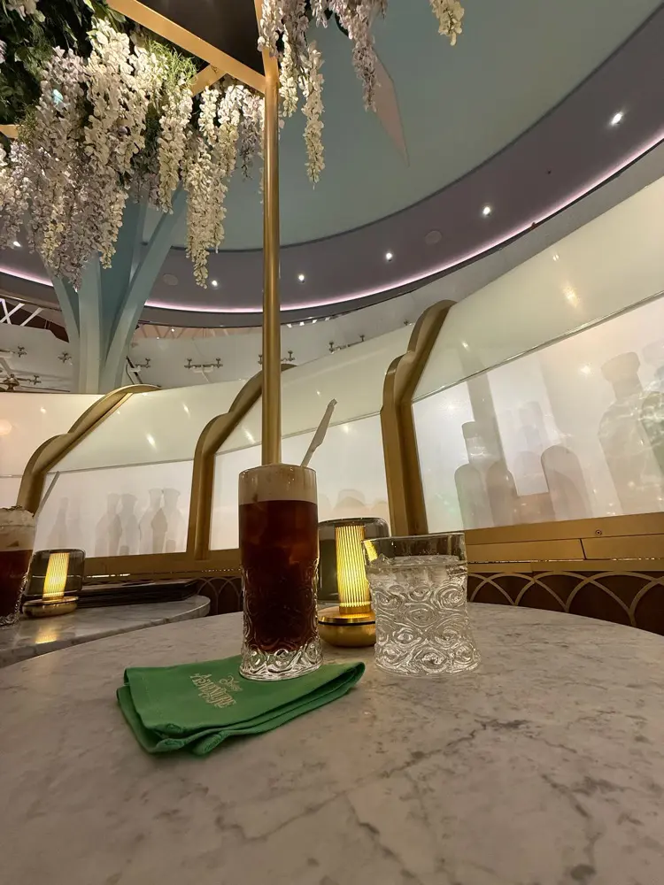 I need you to look at this photo for a moment. That circular bar, the canopy of arching branches and fairy lights above it, the bottles rising up through the centre, Tiana’s Bayou Lounge is one of the most beautiful bars I have seen on any ship, anywhere. It’s inspired by The Princess and the Frog, and it absolutely nails the warm, intimate bayou atmosphere. The cocktail list is brilliant. This is an unmissable stop.