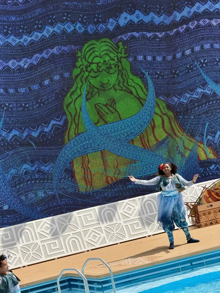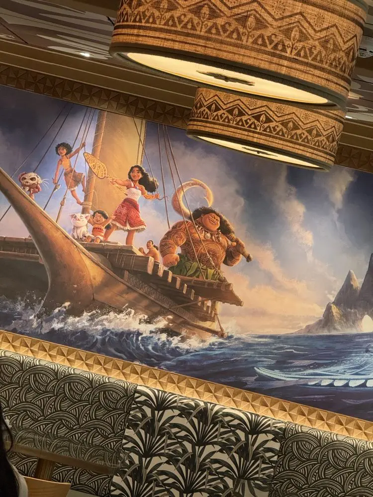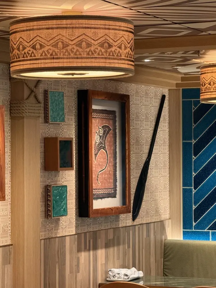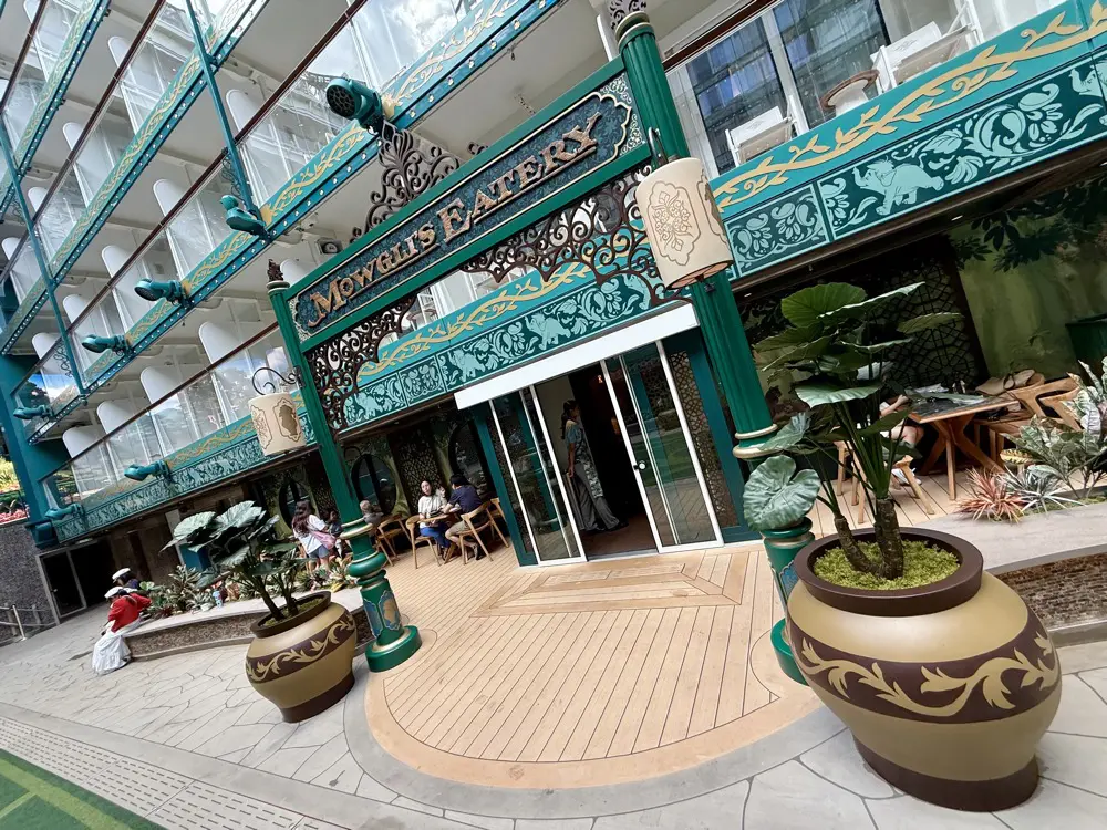 At the very back of the ship sits Wayfinder Bay, a Moana-themed outdoor amphitheatre with a pool, Polynesian detailing, and a large screen for shows. Disney puts on a retelling of the Moana story here, and in the evenings, there’s live music with the open ocean as your backdrop. There is a nearby bar serving refreshments, plus the covered walkway connects it to The Reef, and the two speciality restaurants.