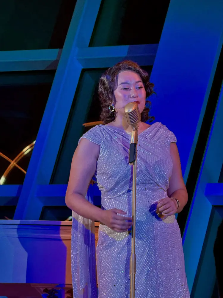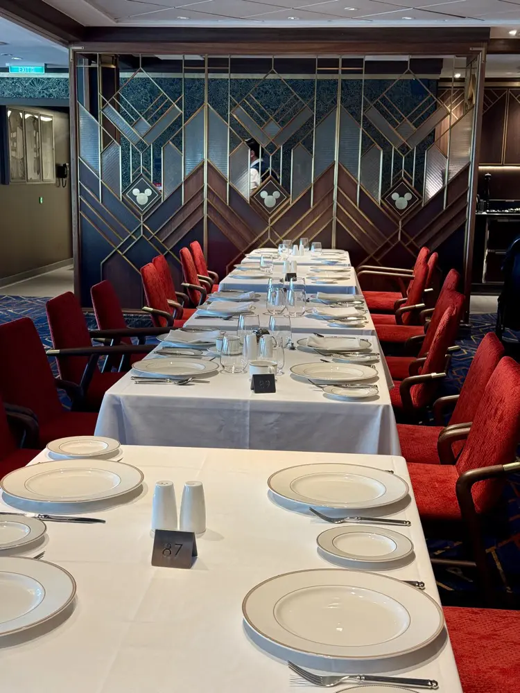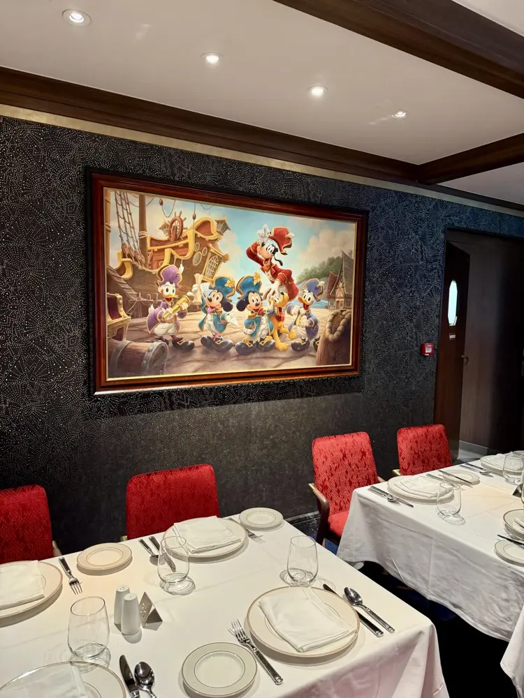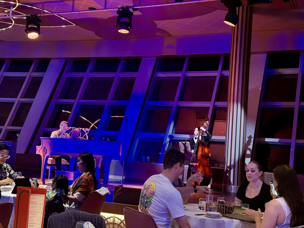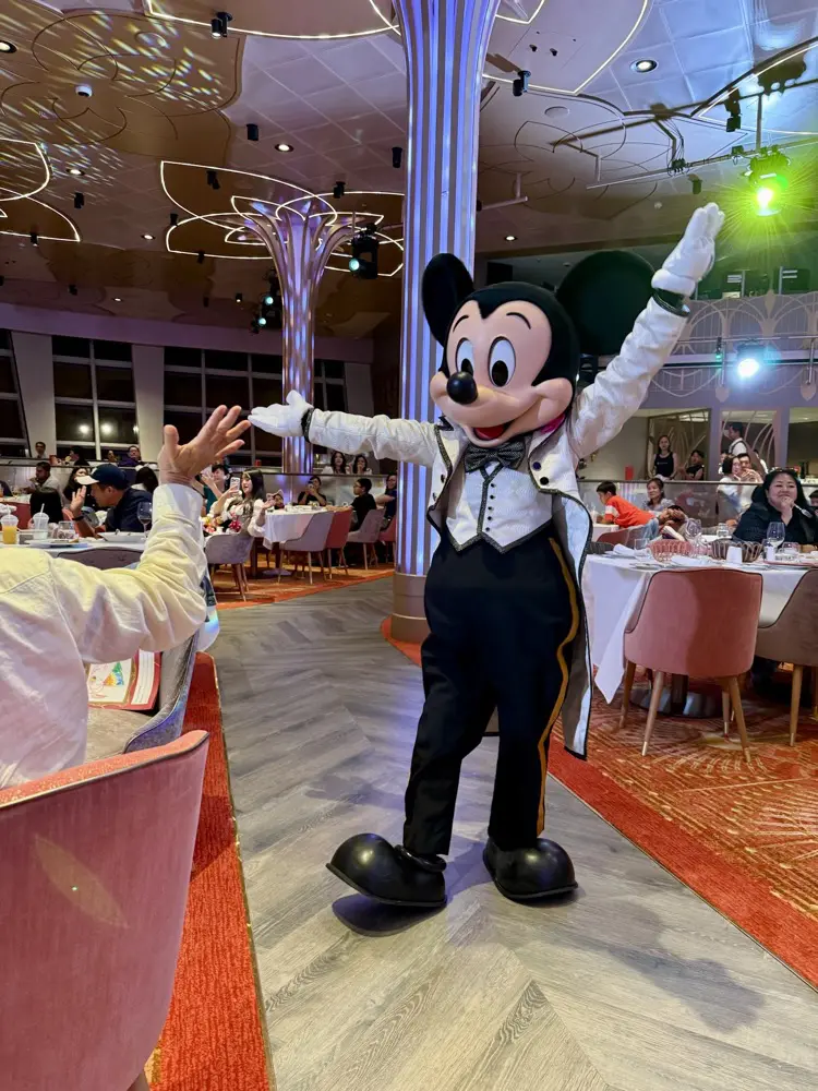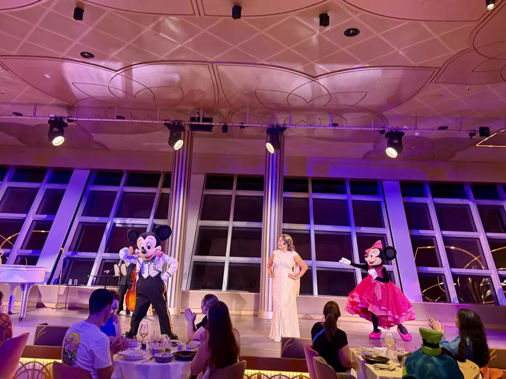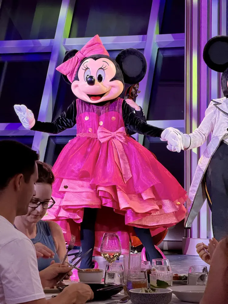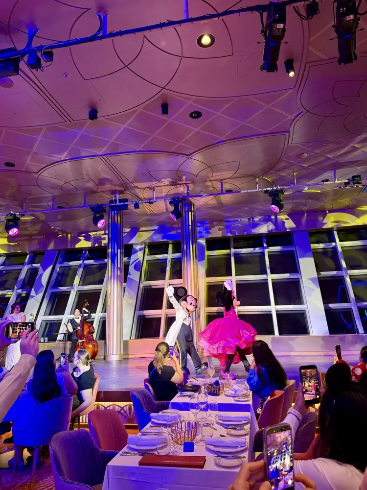 Then, as you dine live pianist and saxophonist start. followed by a singer who comes out performing Disney classics in a 1920s lounge arrangement. And then Minnie Mouse appears in a show-stopping red dress and works the room with Mickey, Donald and Goofy. This is exactly what Disney does better than anyone else at sea.
