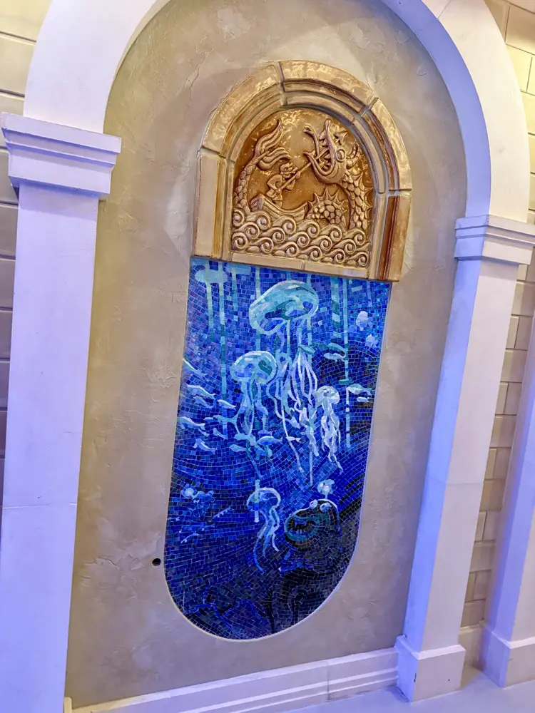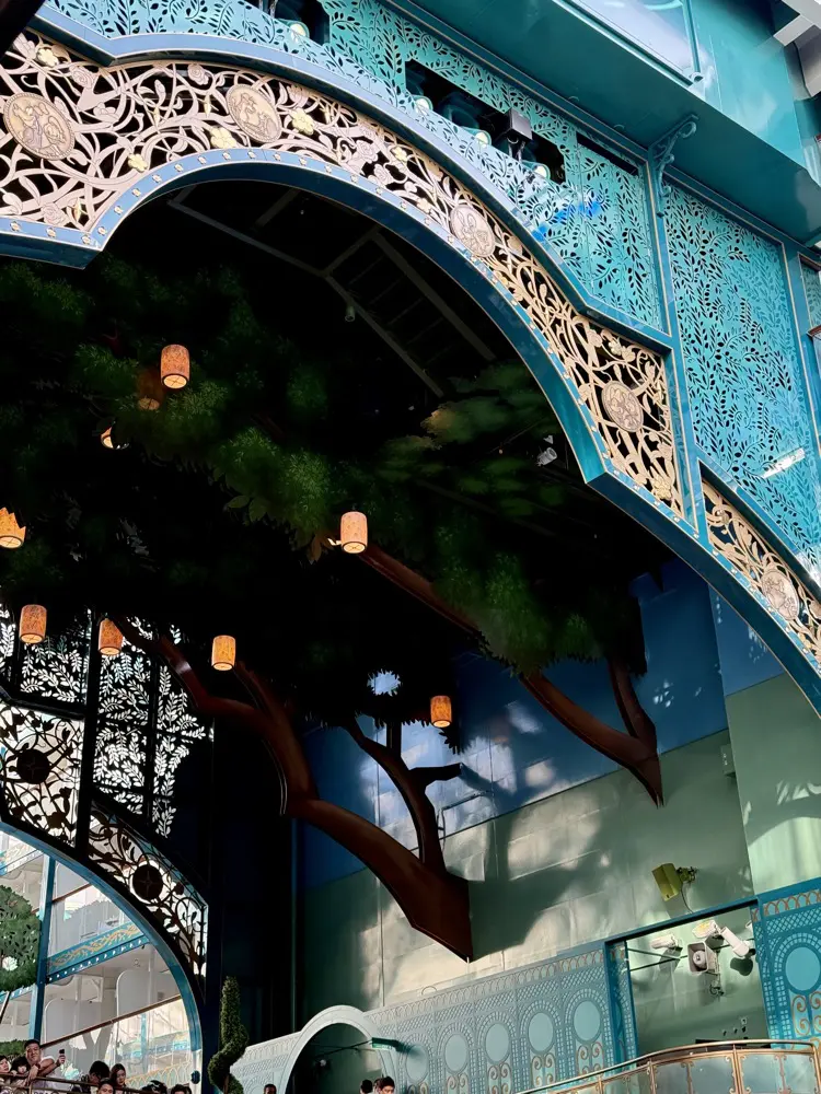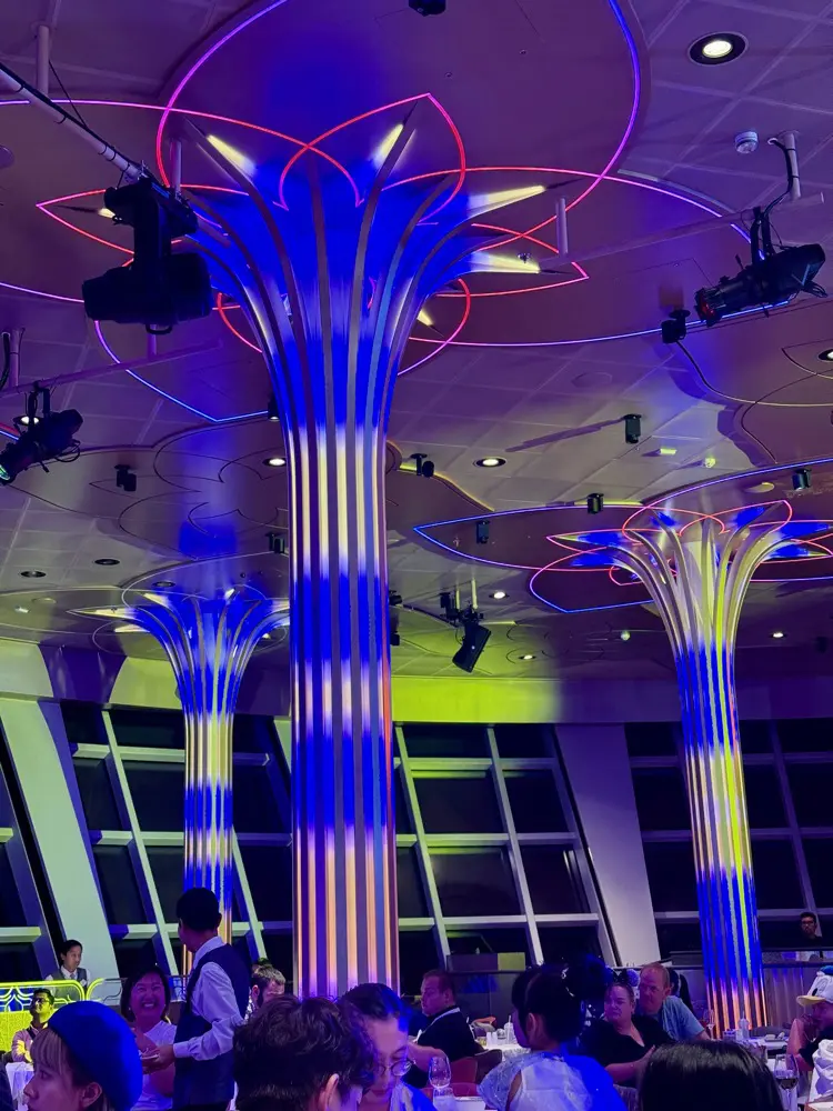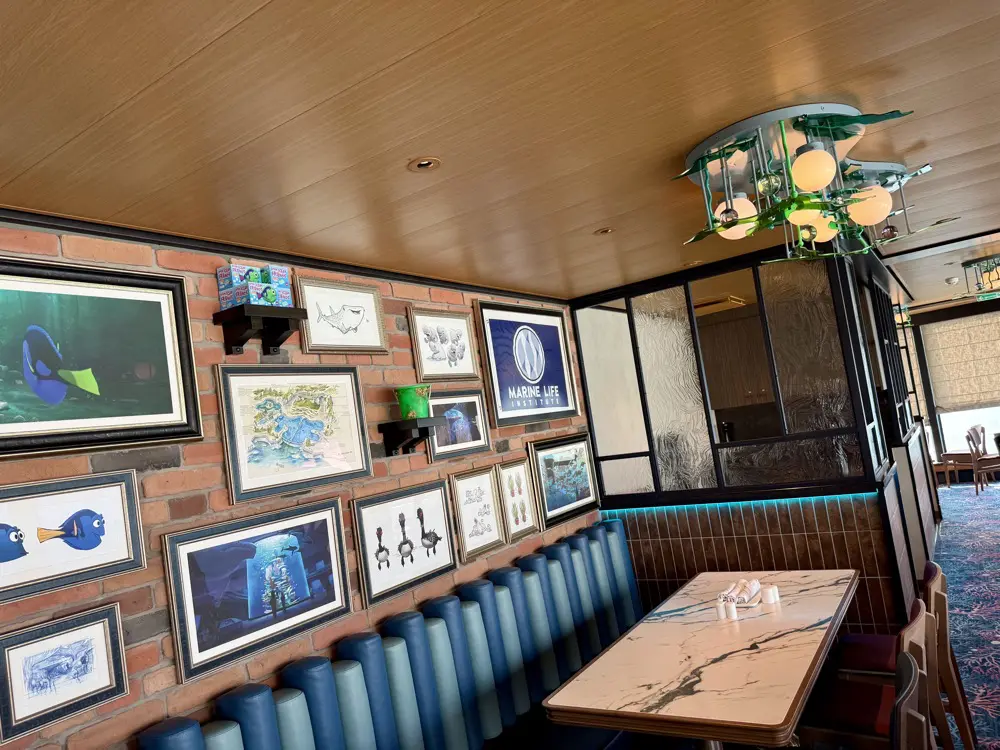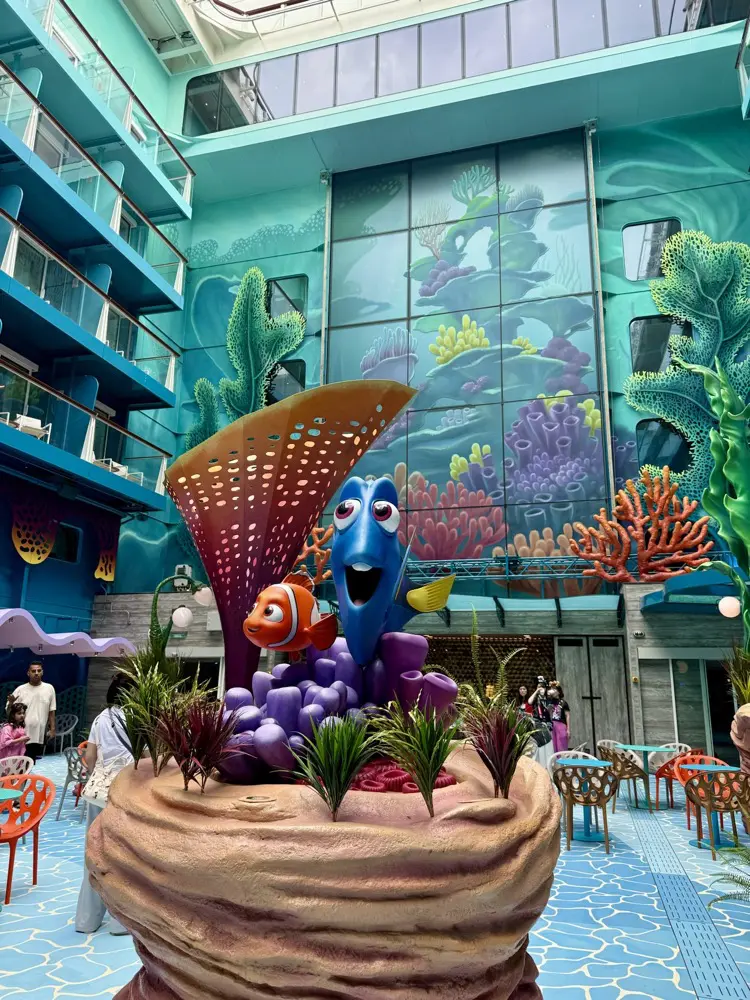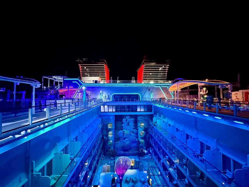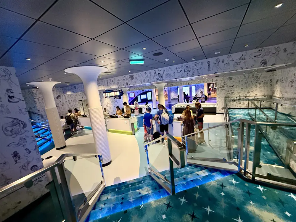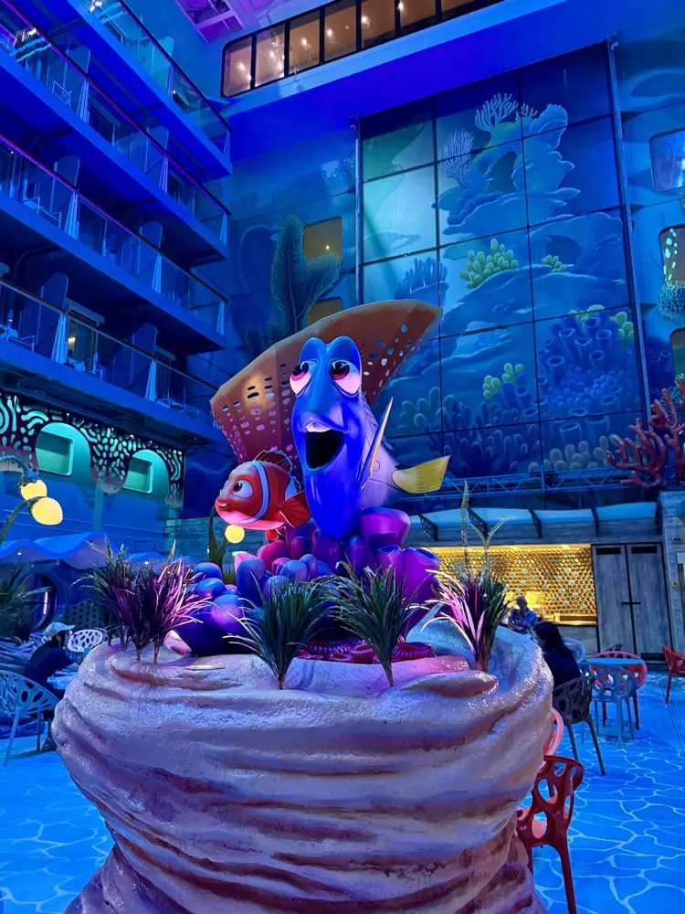Head back through the ship and down a level, and you arrive in The Reef, the second open-air space dedicated to the underwater stories of Disney, such as Finding Nemo and The Little Mermaid. The teal walls and coral murals make it feel like you’re inside an aquarium. Come back after dark when the whole space lights up in blues and greens, and it becomes one of the most photographable spots on the entire ship.