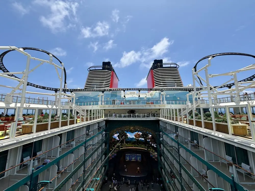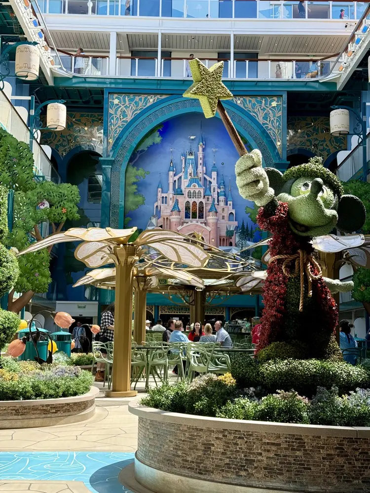 The upper area features a winding garden path, with a Mickey Mouse Topiary, and a gazebo adorned with Tinkerbell, thats all overlooked by the only Disney castle at sea. Its a beautiful space, and one thats nice to relax in as its far enough away from the show stage that it never really feels too busy.