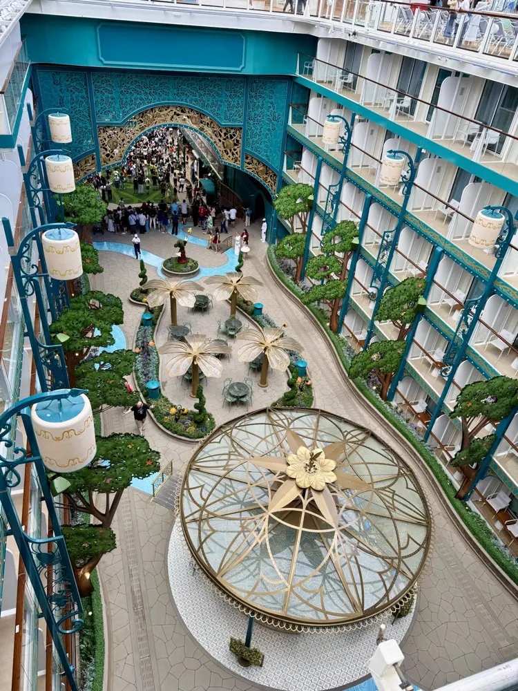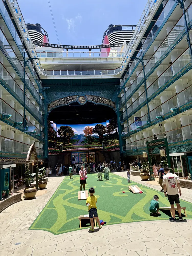 Imagination Garden by day — a semi-covered outdoor space that doubles as the main entertainment stage for the whole ship.