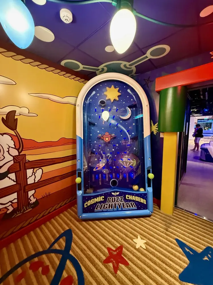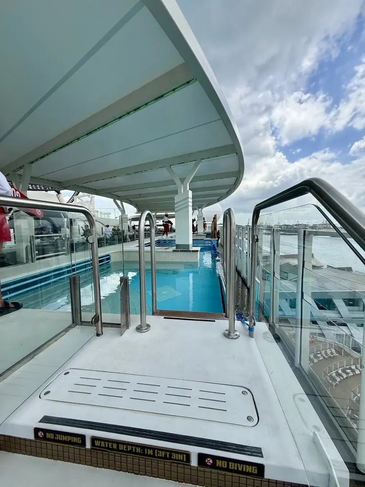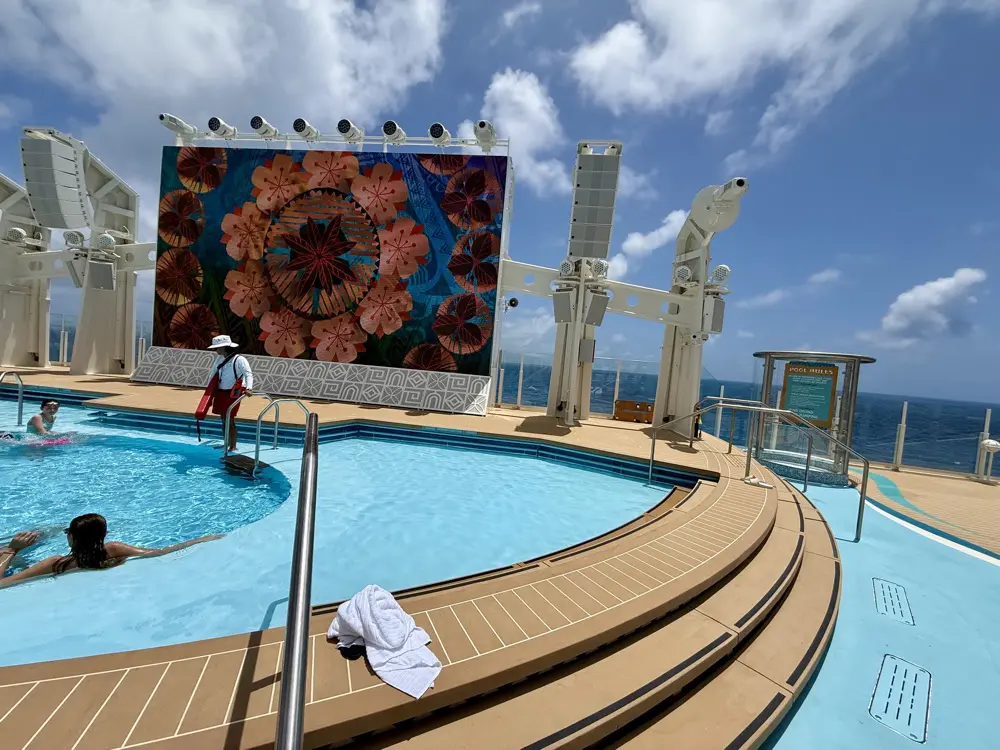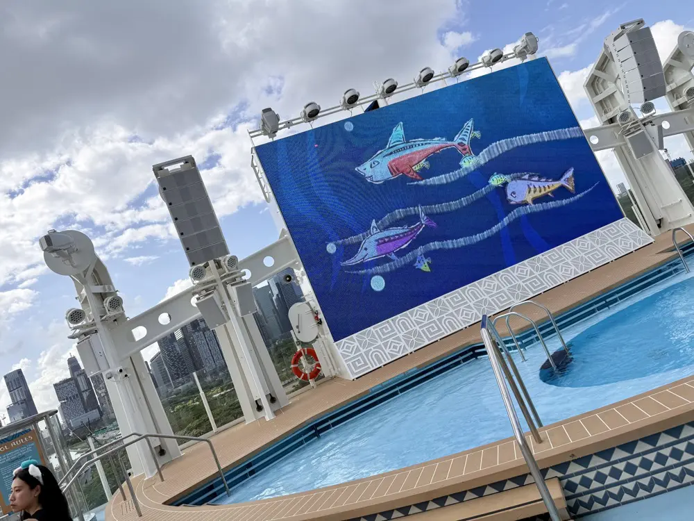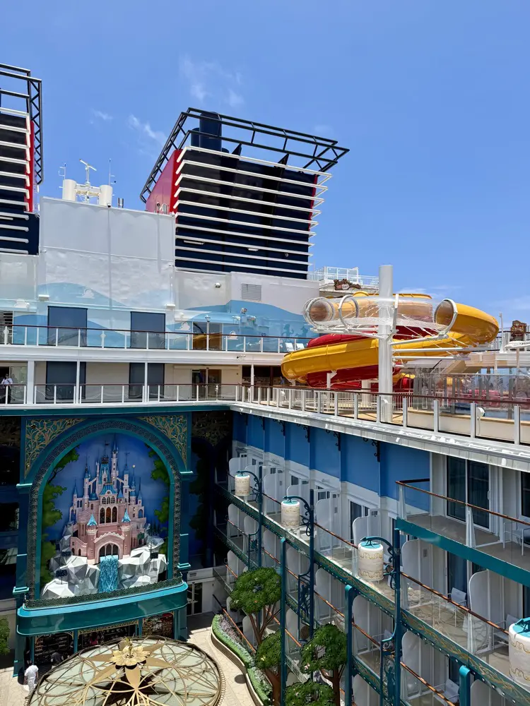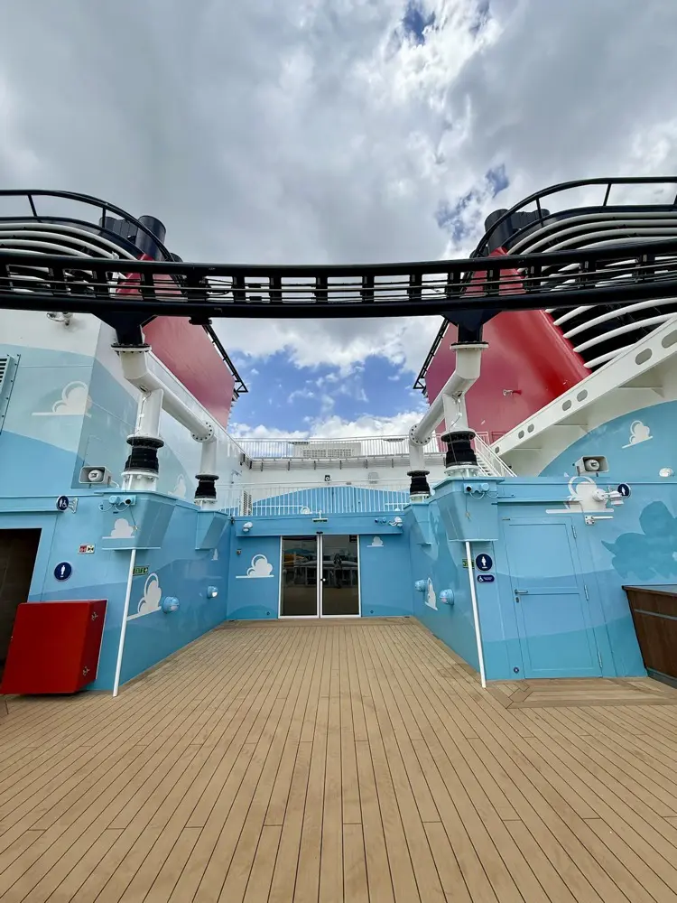 Up to the top decks and you’re in Toy Story Place — the main pool deck, complete with water slides, splash pads and the Market Bar serving drinks in the sunshine. The funnel vision screens dominate the skyline up here, and this is also the prime spot for the ship’s headline outdoor event.
