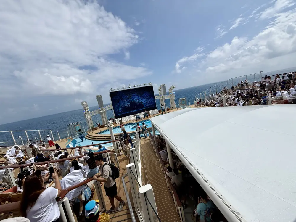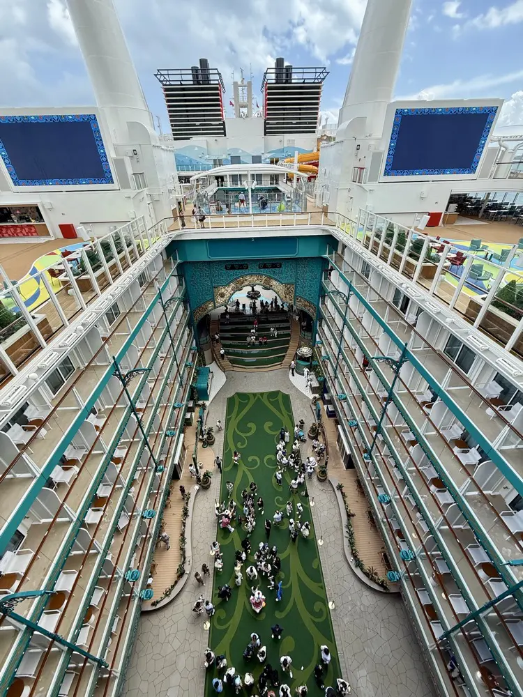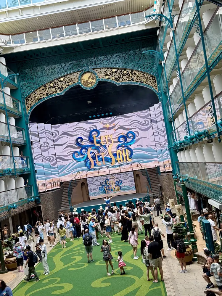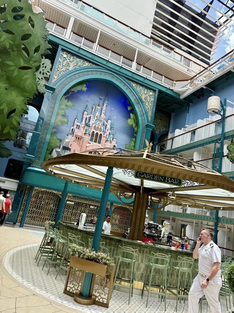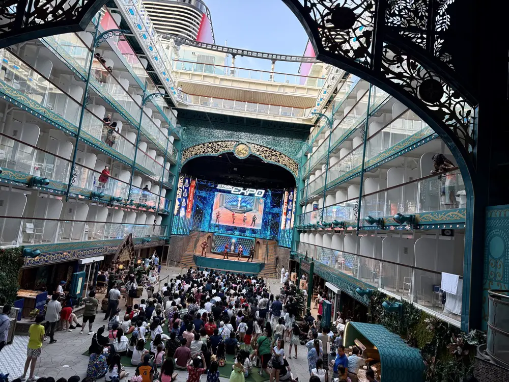 If Town Hall is where you arrive, Imagination Garden is the heart of the ship. This two-level semi-covered space in the middle of the ship is where most of the energy is, and the stage at its heart is genuinely spectacular.
