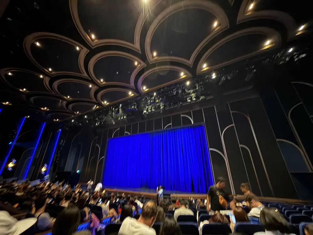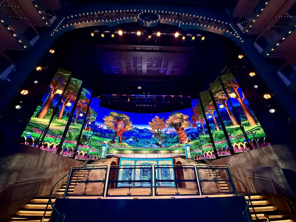 The Walt Disney Theatre is a proper, full-size cruise ship theatre — and that art deco ceiling, all overlapping circles and gold detailing, is beautiful before a single performer has stepped on stage. Two shows call this home: