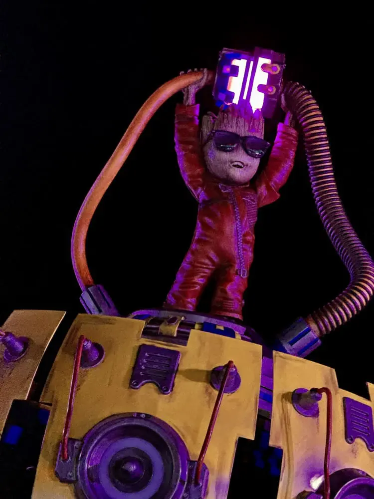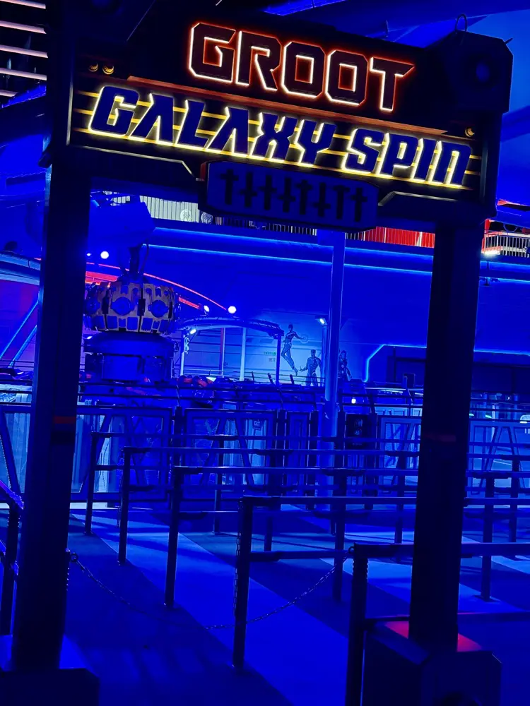 Groot Galaxy Spin is a fun mini spinner attraction, that allows you to control how heigh your space craft spins around Baby Groot, its firmly for little ones, but its a fun attraction.