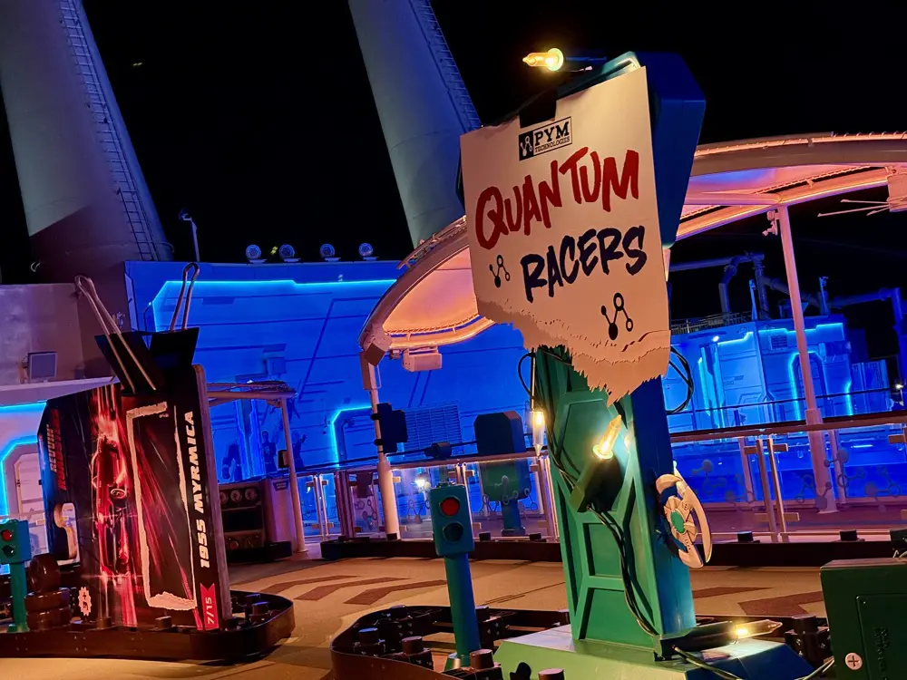 The Quantum Racers — PYM Technologies-branded go-karts — are genuinely fun, especially for kids. And after dark, the whole area comes alive with neon and atmosphere in a way the daytime photos don’t do justice to.