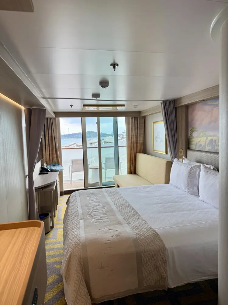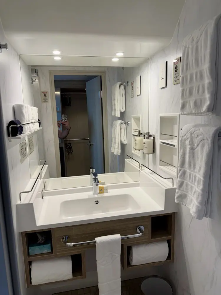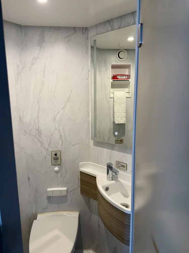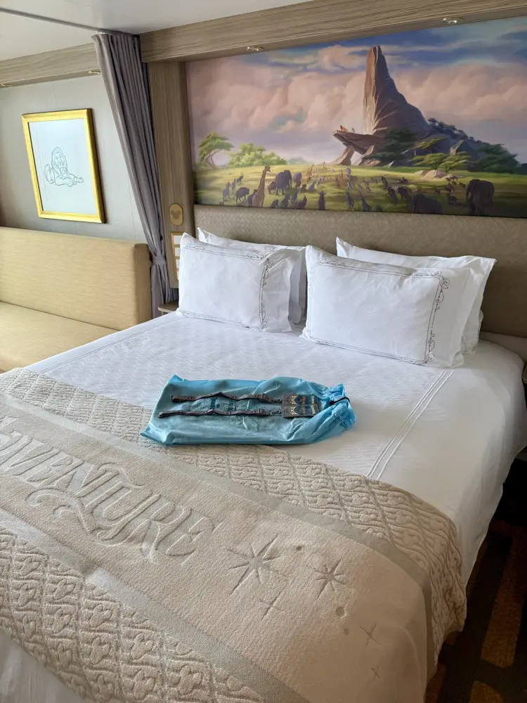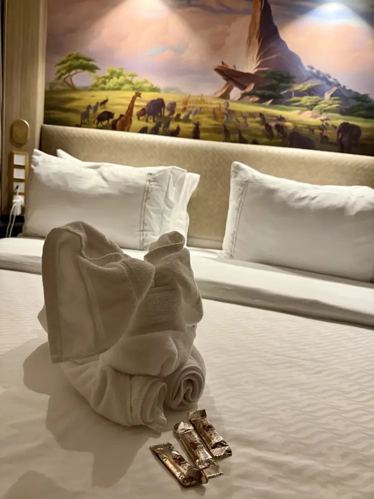 The rooms are more contemporary than the highly detailed theming you’d find on the Magic or Fantasy. Remember, these cabins were largely fitted before Disney took over the shell, but they’re genuinely nice. Modern LED mood lighting with bedside dimmers, USB charging throughout, and Bacha Coffee and TWG tea sachets replenished in the cabin kettle daily.