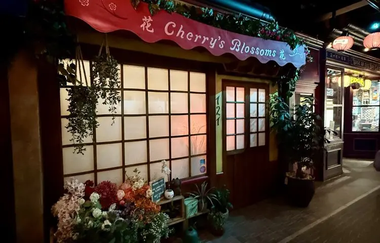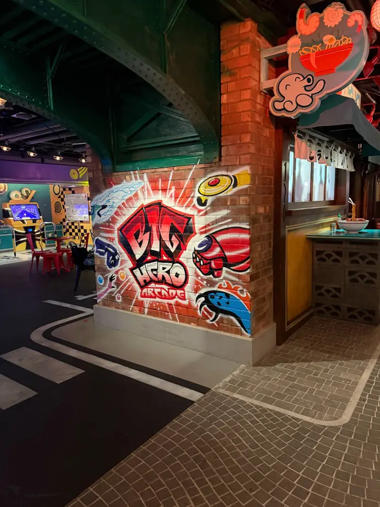 Head forward through the ship, and you arrive in San Fransokyo. Honestly, this area might be the most visually stunning district on the entire ship. It’s a fully realised version of the animated city from Big Hero 6. Cobblestone streets, paper lanterns glowing overhead, Japanese shopfronts complete with shoji screen windows. It’s so much fun to wander through and explore all the details.