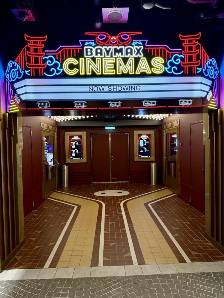 The Baymax Cinemas entrance — four screens, one spectacular neon marquee, Baymax’s face in the floor tiles.