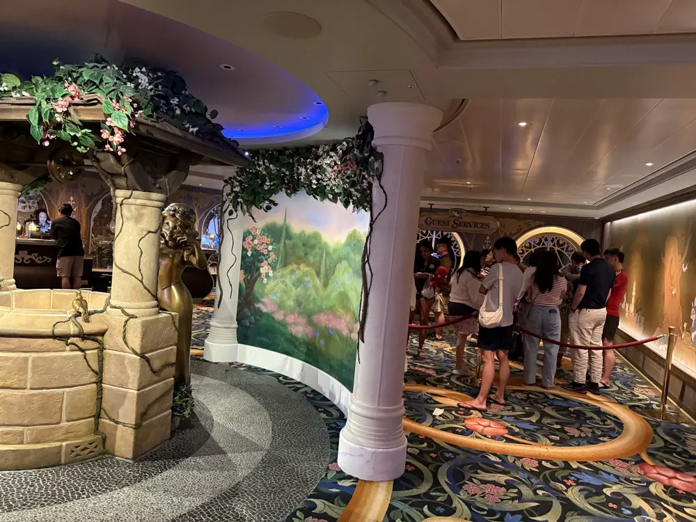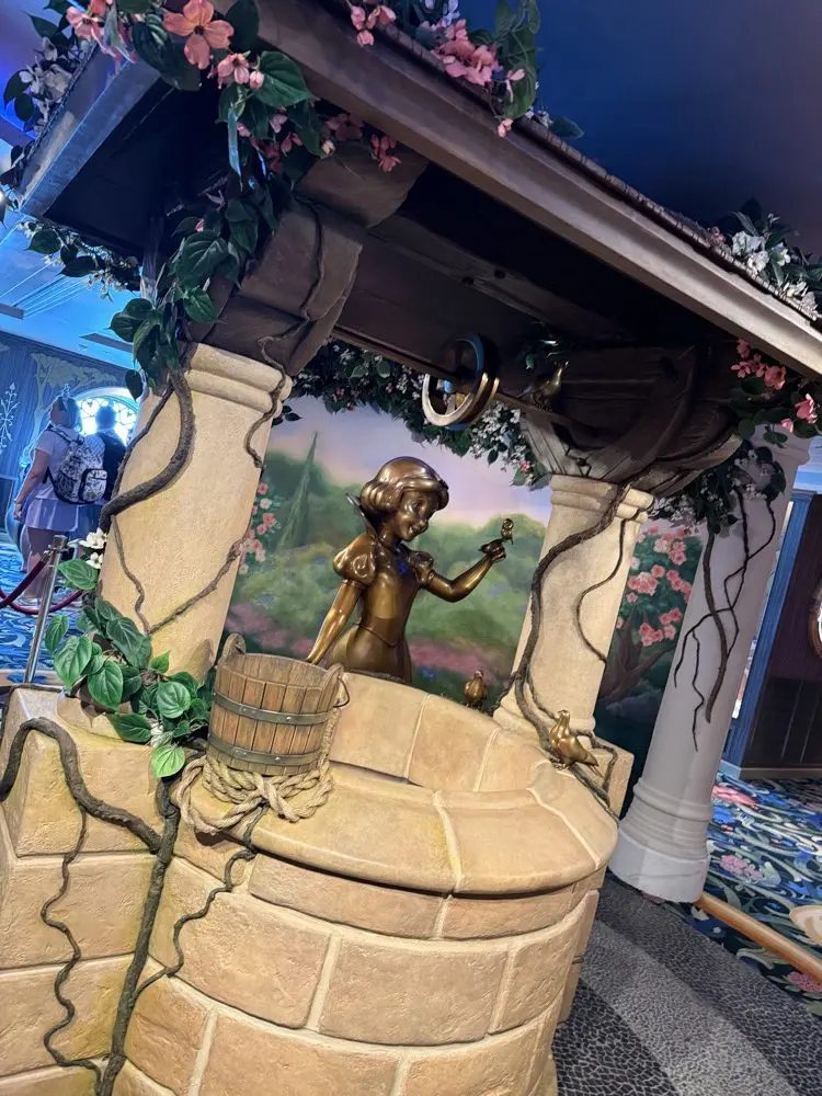 At the heart of Town Hall is a bronze Snow White at her wishing well, surrounded by flowers. It’s a beautiful, slightly unexpected choice compared to the other Disney Cruise Line statues that feature in the Grand Atrium elsewhere, but she’s the original. The fairy tale that launched Disney animation in 1937. If any character earns that centrepiece spot of a Hall that is dedicated to all the Disney Princesses and looks like a fairytale forest, it’s her.