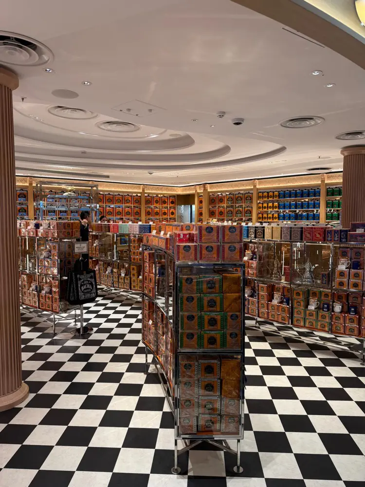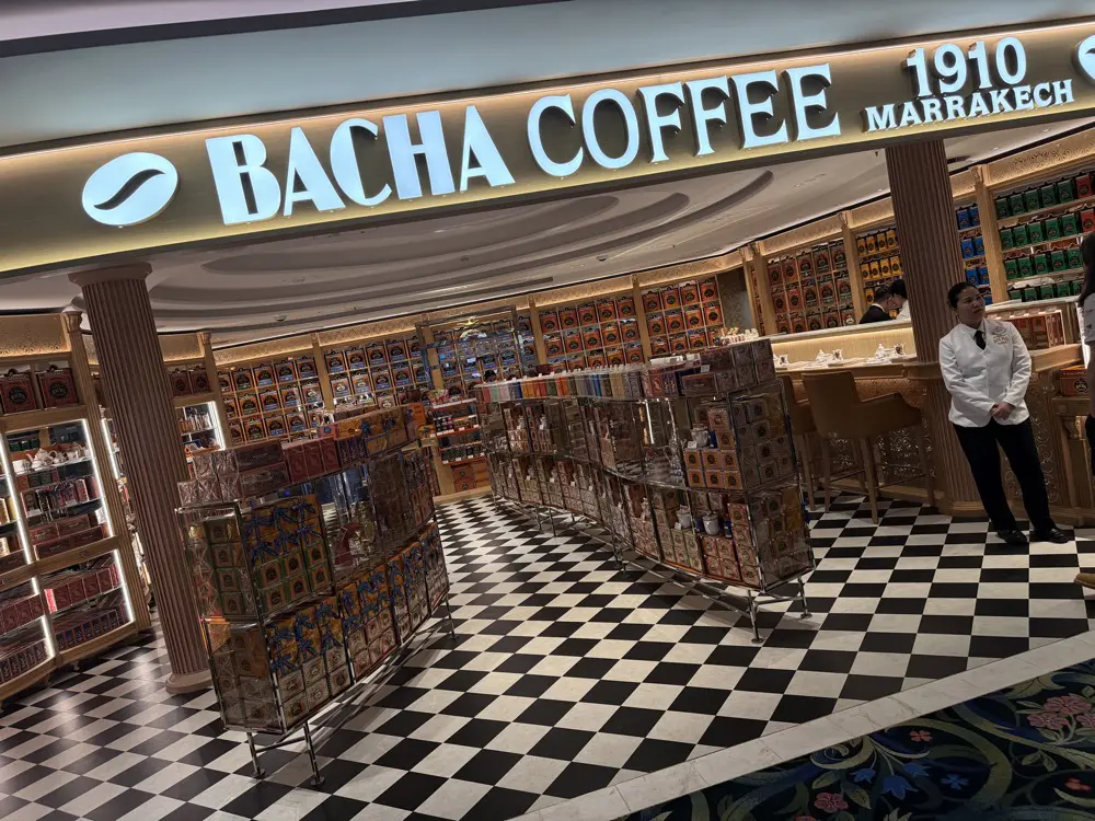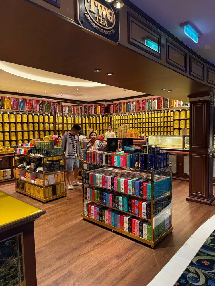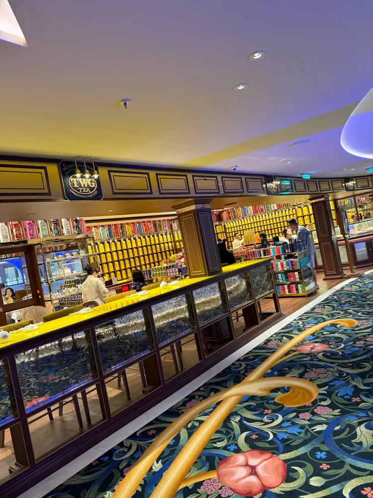 Up above Town Hall are two shops that genuinely stopped me in my tracks: Bacha Coffee and the TWG Tea Boutique. Bacha is a premium Moroccan-heritage coffee brand, and their installation on board offers over 200 varieties. Their store, all black and white checkerboard floors and walls lined with coffee tins, is stunning even before you’ve had a sip. I was having pistachios. I was having brown sugar. I had things I couldn’t pronounce. At around $8 a cup, with a complimentary glass straw if you want to take it away, or in a bone china cup if you want to have it to stay, all topped off with chantilly cream to make the already indulgent coffee that little bit more indulgent, if that’s even possible.