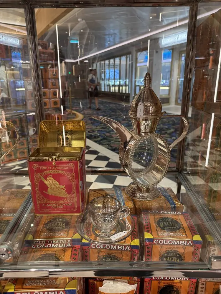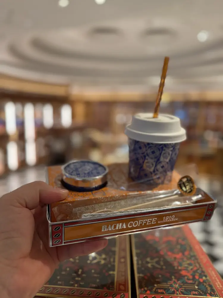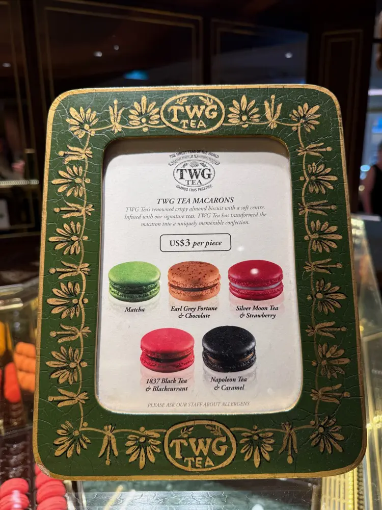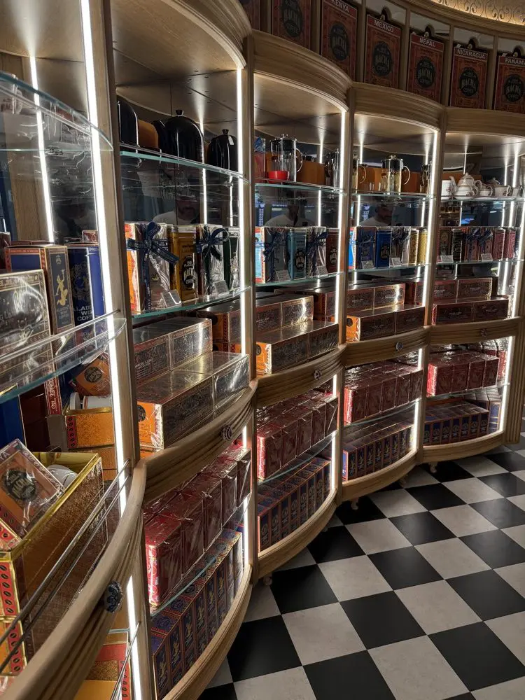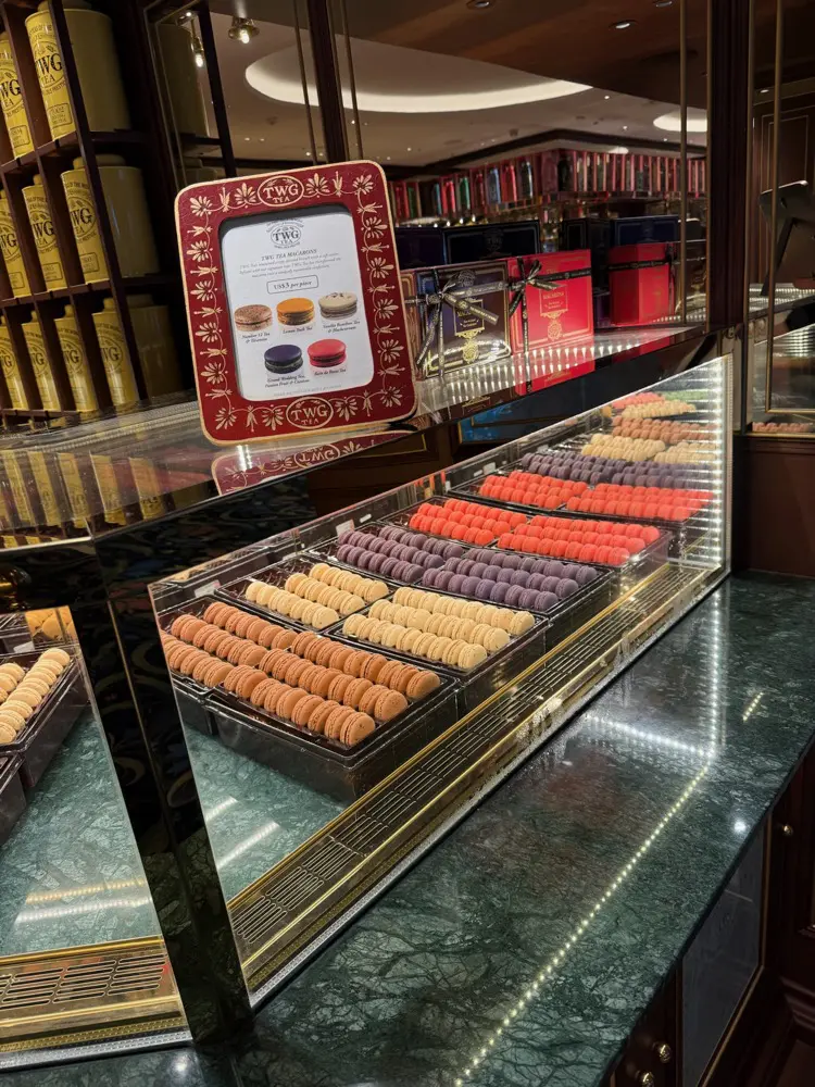 Up above Town Hall are two shops that genuinely stopped me in my tracks: Bacha Coffee and the TWG Tea Boutique. Bacha is a premium Moroccan-heritage coffee brand, and their installation on board offers over 200 varieties. Their store, all black and white checkerboard floors and walls lined with coffee tins, is stunning even before you’ve had a sip. I was having pistachios. I was having brown sugar. I had things I couldn’t pronounce. At around $8 a cup, with a complimentary glass straw if you want to take it away, or in a bone china cup if you want to have it to stay, all topped off with chantilly cream to make the already indulgent coffee that little bit more indulgent, if that’s even possible.
