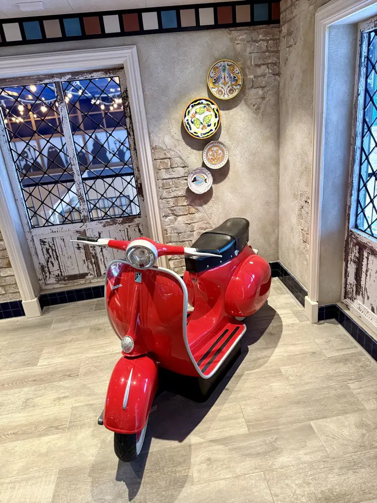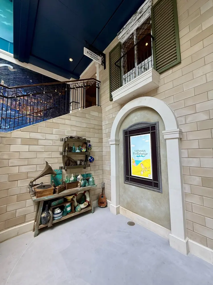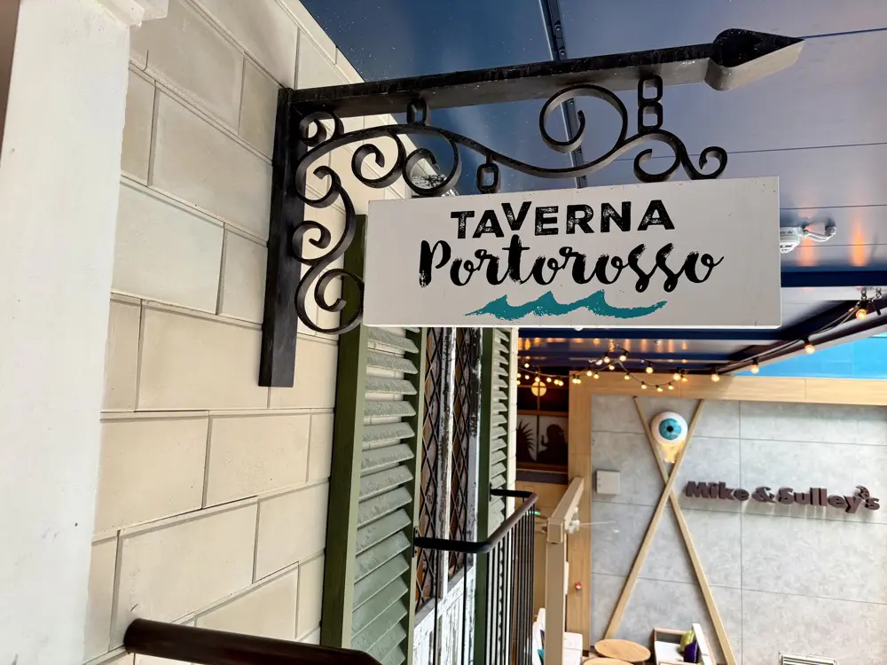 And then there’s Taverna Portorosso — the Luca-themed bar that sits upstairs from Palo Trattoria and across from Mike & Sully’s, connecting the two with its Italian coastal character. The hanging sign, wrought-iron bracket, and shuttered exterior make it feel genuinely like a side street in Portorosso. Lovely spot for a glass of wine before or after dinner. The Vespa is a great photospot too.