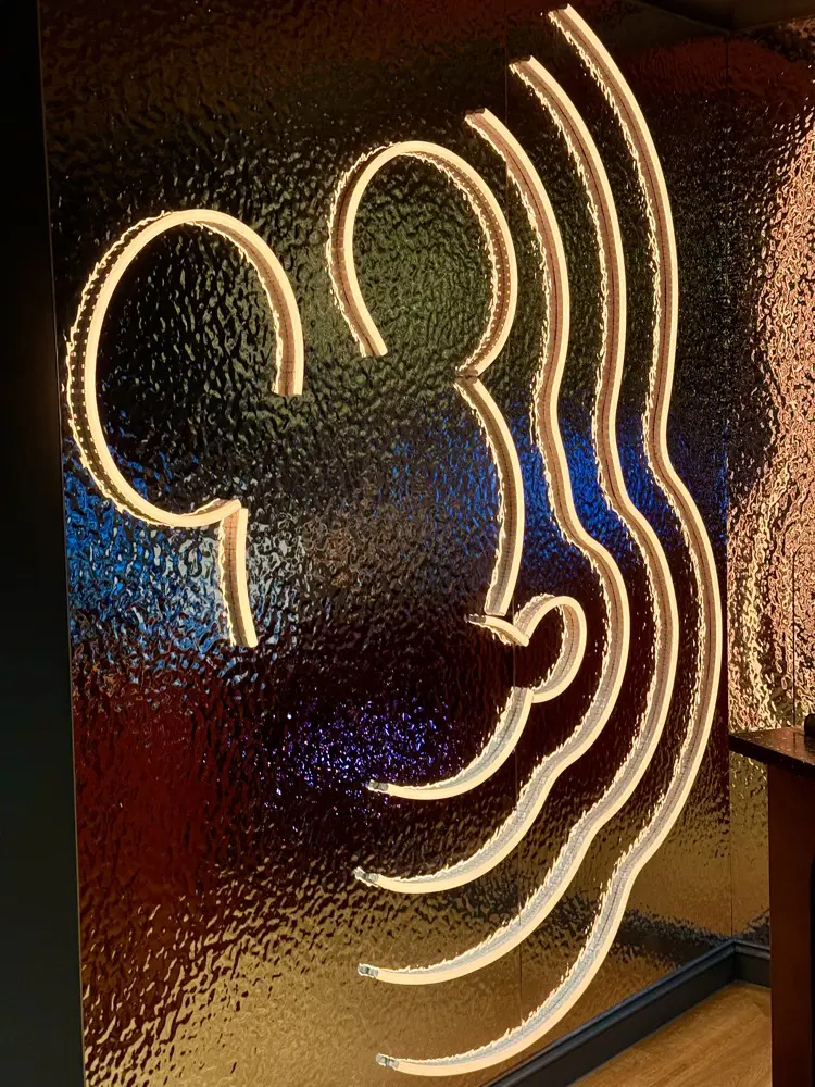 Vibe and Edge (San Fransokyo) — stunning teen and tween spaces with their own distinct atmosphere. The neon Mickey silhouette etched into the entrance glass is a small detail but a brilliant one. – Check the San Fransokyo section for photos. of these clubs as they are located there.
