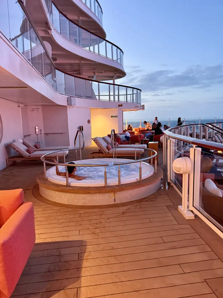 Two infinity-edge pools, hot tubs, proper shade, and arguably the best cocktail list on the ship. Make this your base.