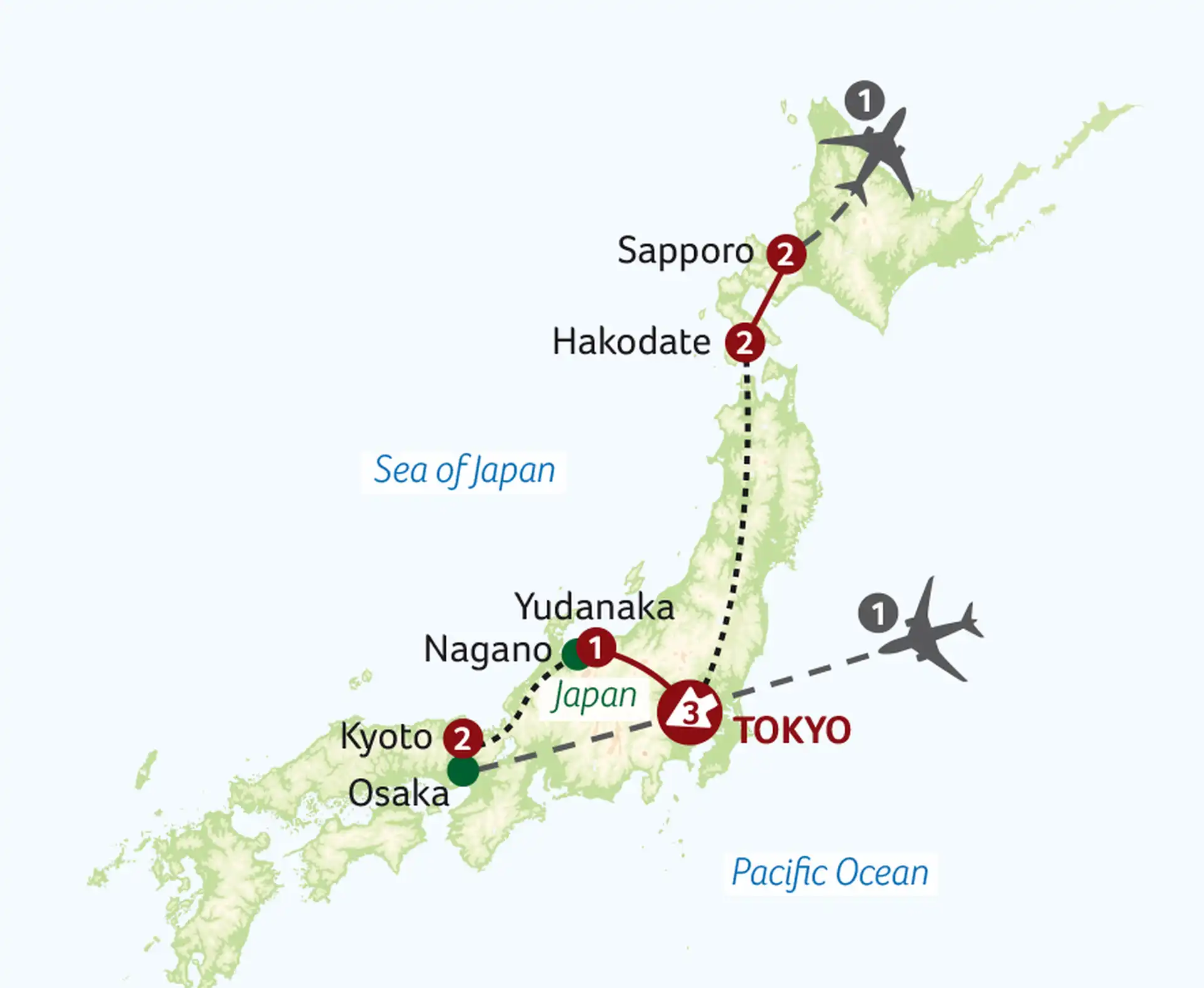 • Main stops: Kyoto, Yudanaka (ryokan), Tokyo, Hakodate, Sapporo