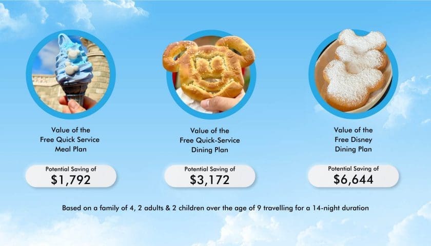Value, Moderate, Deluxe and Deluxe Villa resorts all qualify, though the dining plan you receive varies by tier. Value guests receive a Free Quick-Service Meal, Moderate guests receive the Quick-Service Dining Plan, and Deluxe/Villa guests receive the Table-Service Dining Plan.
